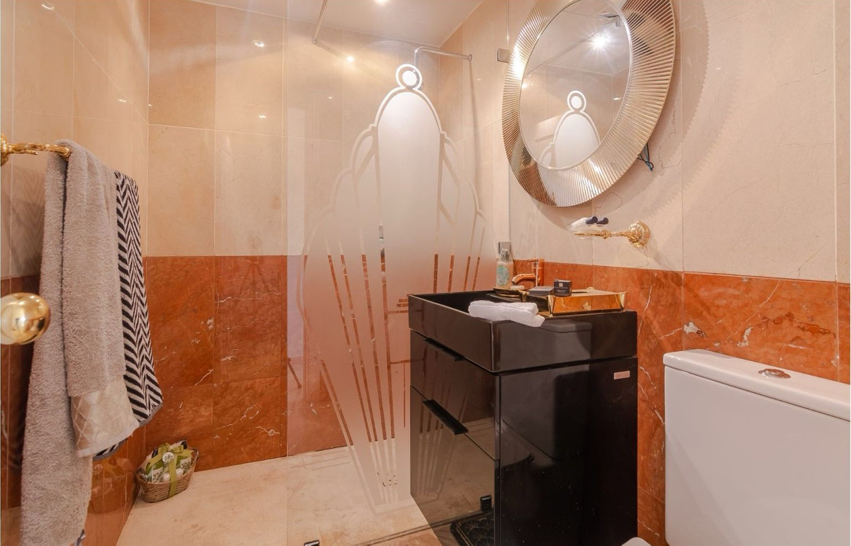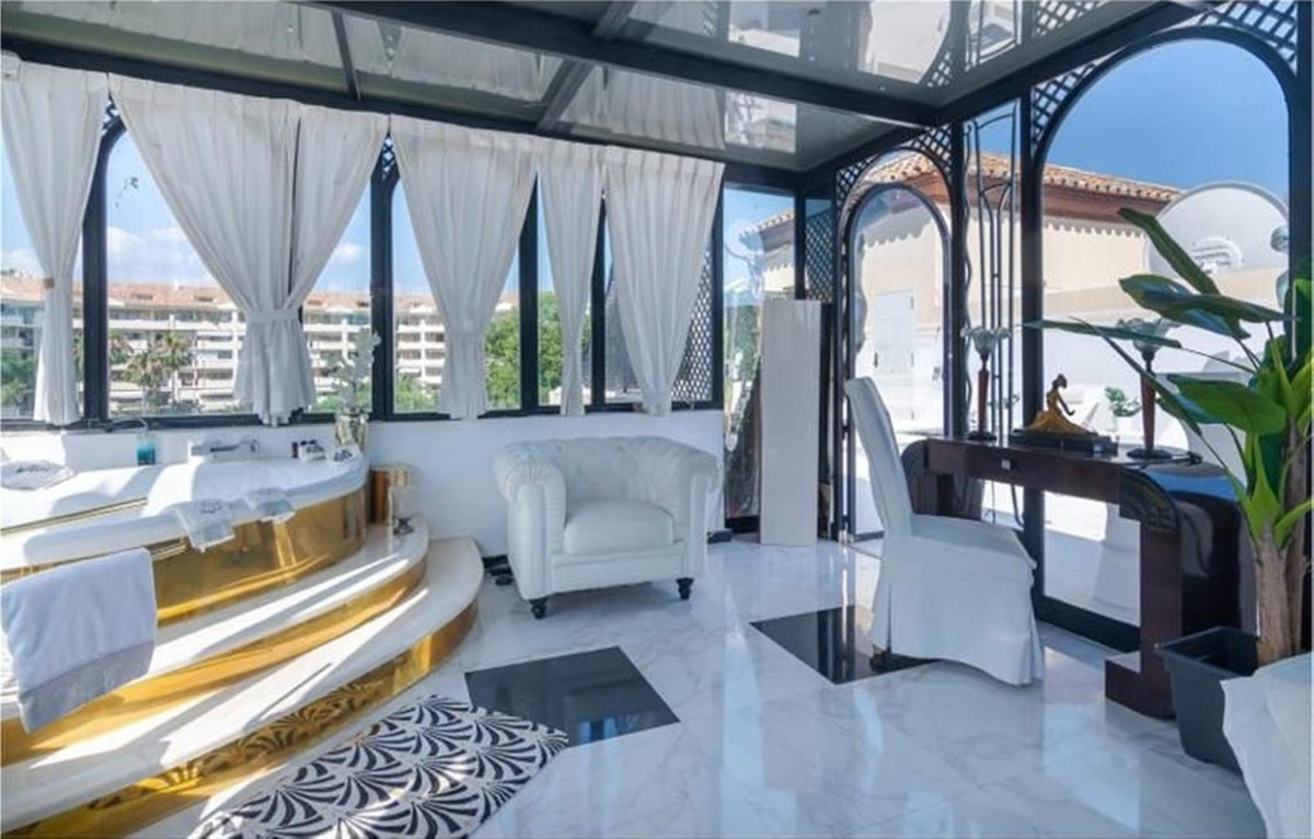 The master bedroom includes an en-suite bathroom, as does the second bedroom. Both are bright and comfortable. From the dining area, a staircase leads to the upper level, where there’s an additional conservatory-style bedroom with a jacuzzi and direct access to a large 65 m² solarium. This rooftop space includes a private plunge pool and enjoys excellent views.