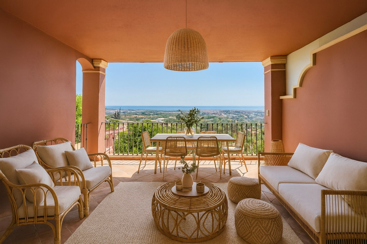 The living room opens directly onto a spacious south-facing terrace, offering endless panoramic views of the Mediterranean and the Marbella skyline a space where the blue of the sea becomes part of your daily life.