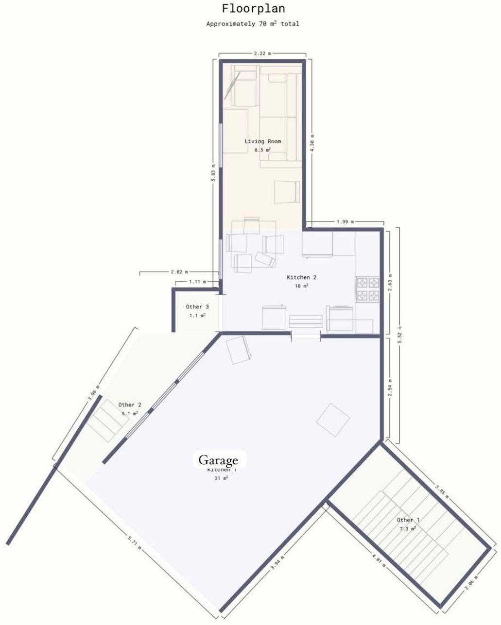 Vanuit de garage is er toegang tot de nieuw gebouwde keuken/woon- en eetkamer met een totale oppervlakte van 70 m²
