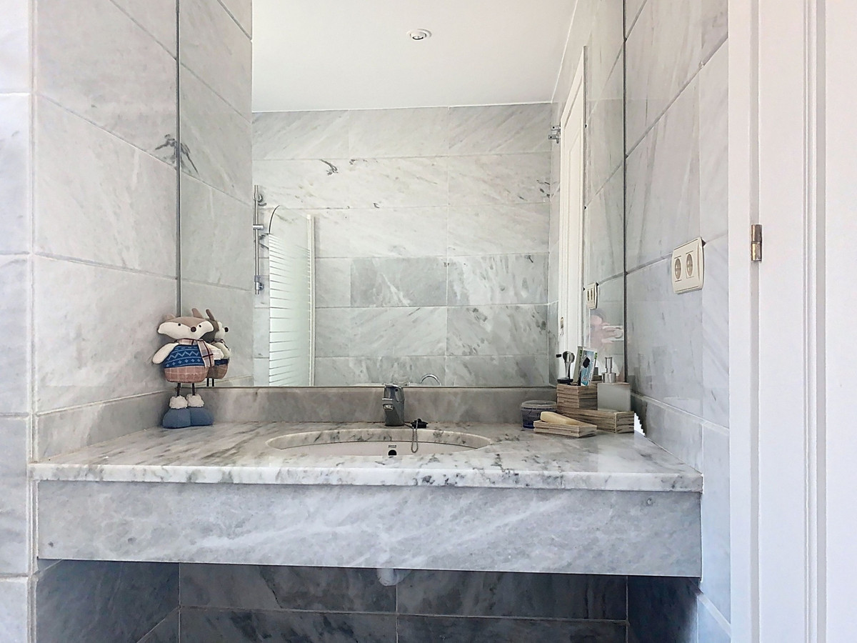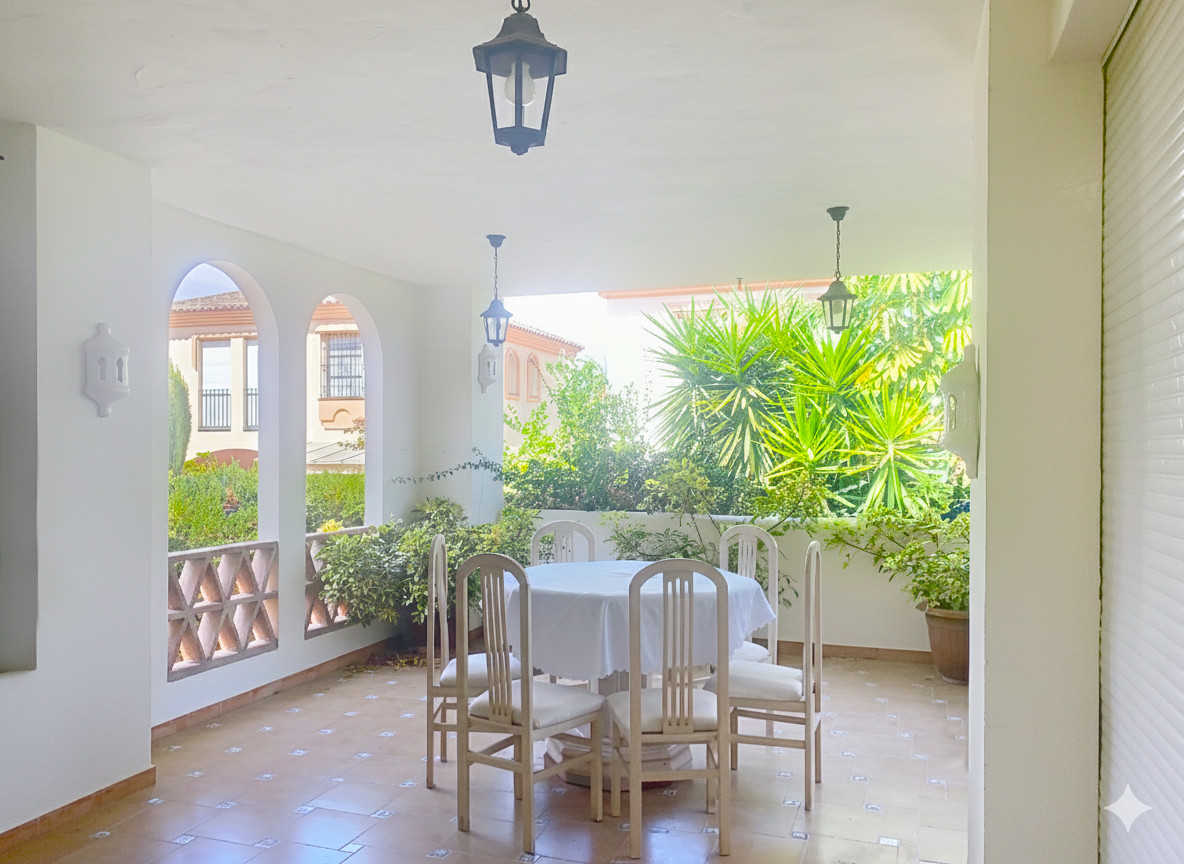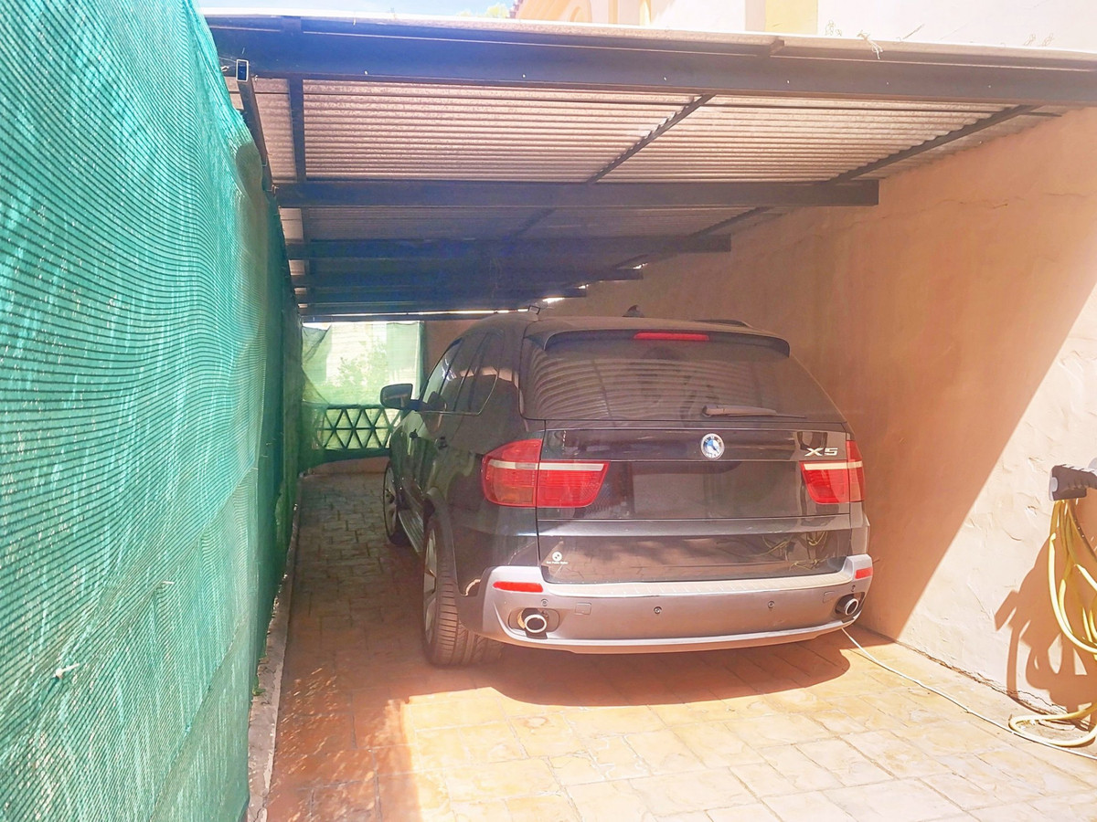 Het privéperceel beschikt over twee patio's. De entreepatio omvat een veranda en een overdekte carport voor twee voertuigen, die toegang geeft tot het huis. Op de begane grond bevindt zich een ruime woon-eetkamer met een open haard en marmeren vloeren, wat een elegante en gastvrije sfeer creëert. De halfopen keuken, volledig uitgerust voor dagelijks gebruik, staat in verbinding met zowel de eetkamer als de entreepatio. Op deze verdieping bevindt zich ook een gastentoilet voor extra gemak. Vanuit de woon-eetkamer is er toegang tot een overdekt terras van 40 m², perfect om te genieten van het mediterrane klimaat. Beneden sluit het terras aan op de voorpatio, een ruimte met weelderige begroeiing en schaduw die, naast een zijtoegang vanaf de straat en een eigen ingang naar het gastenverblijf, beschikt over een poort met directe toegang tot het gemeenschappelijke zwembad.