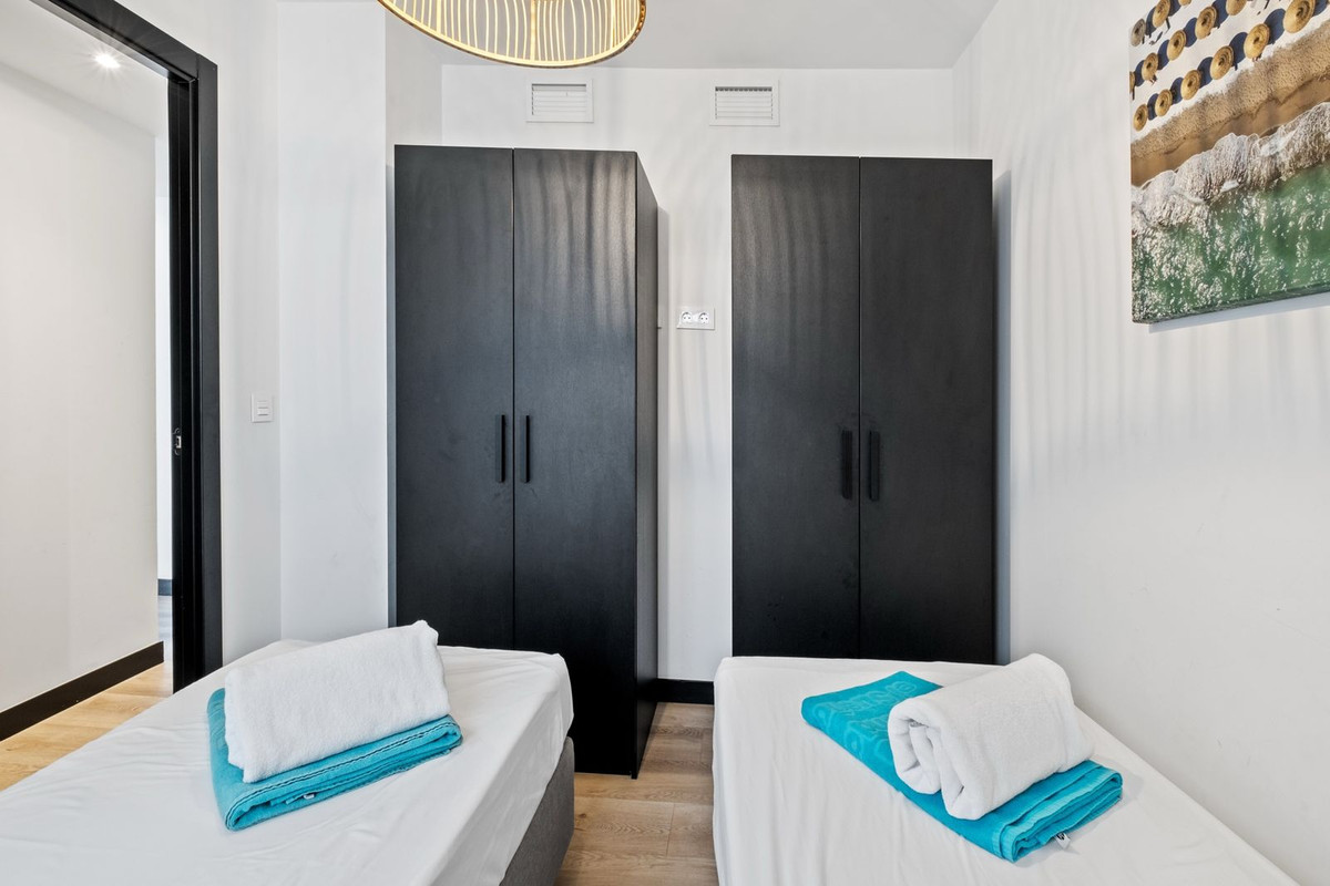 The apartment offers three bedrooms (one with a bunk bed) and a stylish bathroom with a spacious walk-in shower. It comfortably accommodates up to six people, making it ideal for families, couples, or as a rental investment.