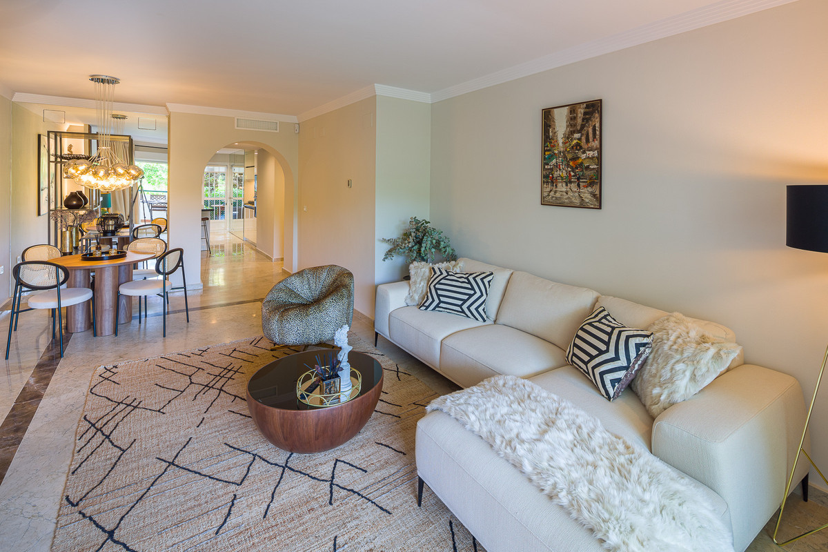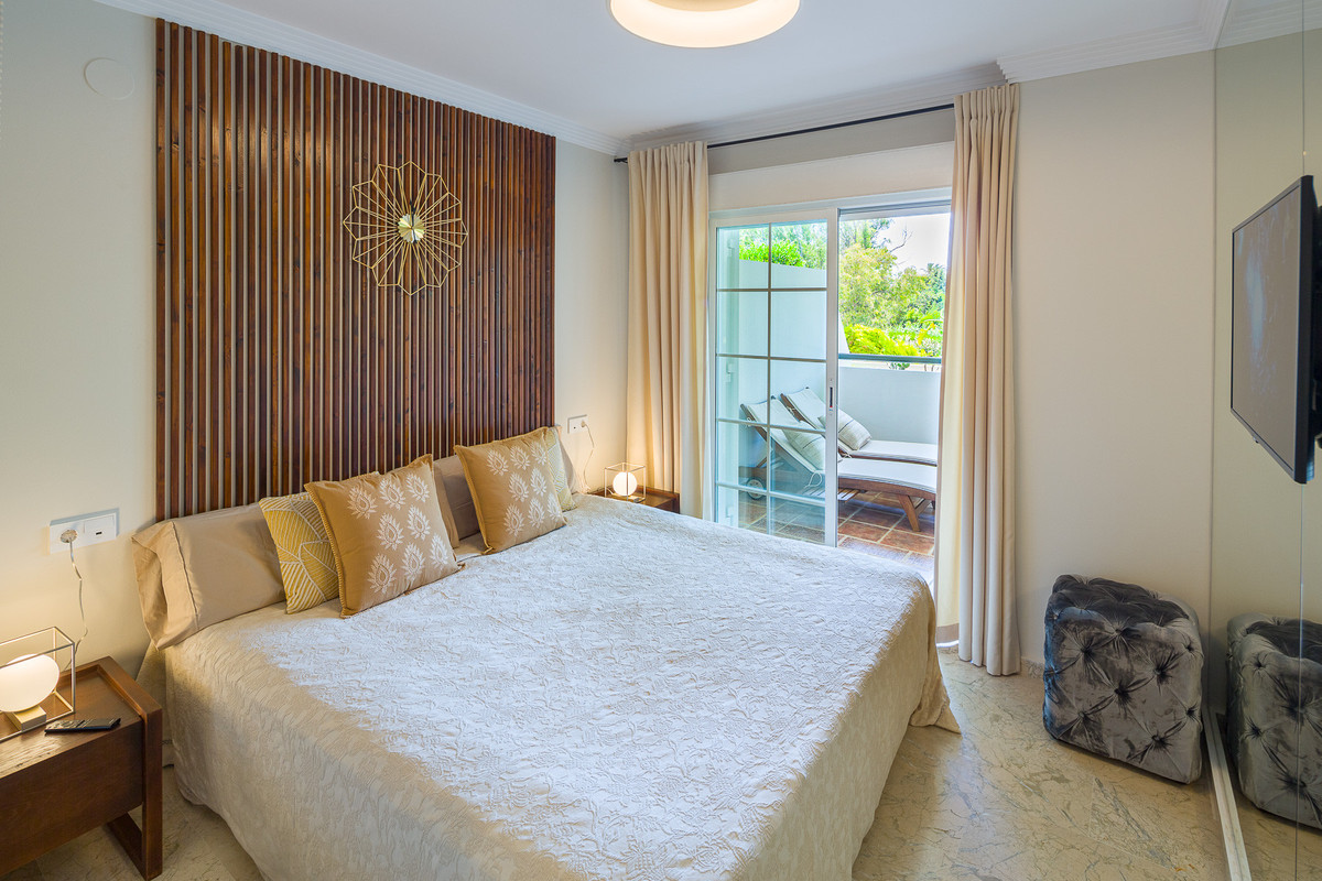 Newly renovated Luxury design, cozy apartment in prestigious Marbella Golden Mile urbanization "Balcon de Puente Romano", next to “Puente Romano Nobu”, “Marbella Club”, the beach and sea - 3-5 min walking distance. Bright and spacious apartment with a brand-new furniture and top-quality equipment, 2 modern bedrooms, 2 bathrooms, 2 big terraces, HD TV in each room, air conditioner with 3 different climate zones, 24 h access to newly renovated swimming pool. For your comfort and luxury living in tropic garden surround. Private underground parking is included.