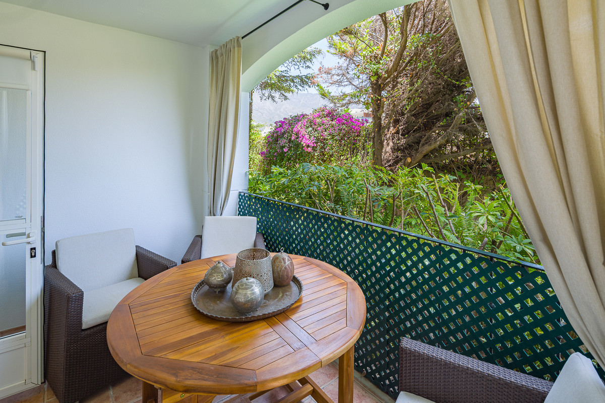 Access from the living room to a big terrace with table for 7-8 persons and 2 comfortable sunbeds, swimming pool and tropical garden view.