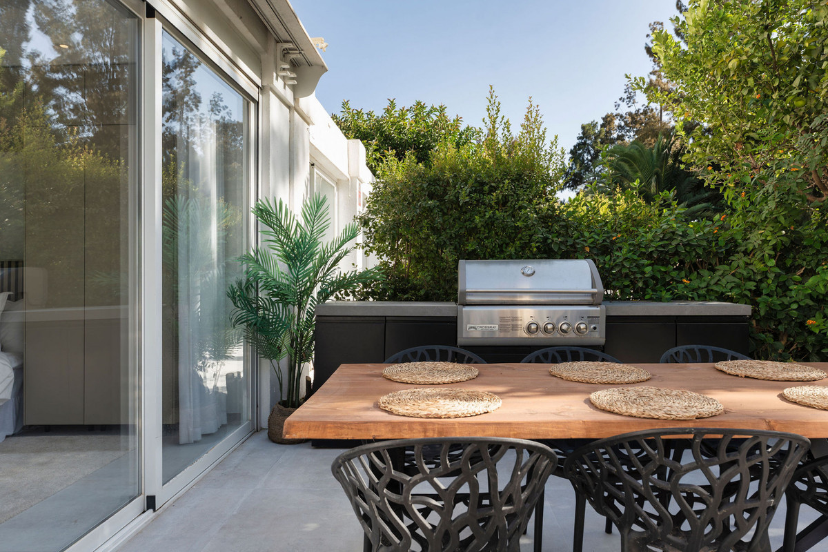 The terrace extends the living space outdoors, creating a natural transition ideal for relaxation and entertaining. With dedicated areas for lounging and dining, including a built-in barbecue, this space invites al fresco meals with stunning sunset views and the peaceful backdrop of the golf course’s greenery. The kitchen, fitted with Siemens appliances, is sleek and minimalist, designed to maximize efficiency without compromising on aesthetics.