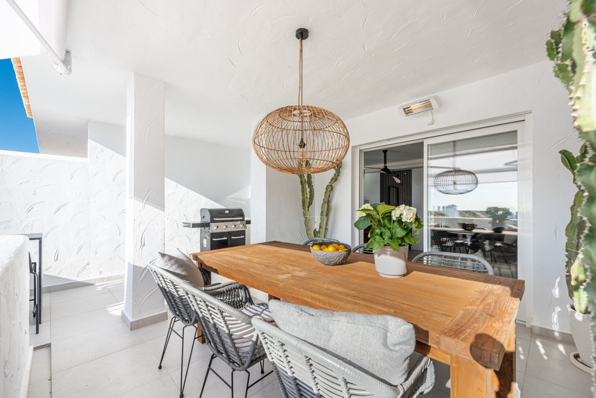 Located in the sought-after urbanization of El Dorado in Nueva Andalucia, this Duplex Penthouse is a symbol of luxury and convenience. Designed with modern Scandinavian elegance, the property spans two floors, featuring three bedrooms and three bathrooms. The ground level has a bright, open-plan kitchen with premium appliances, seamlessly merging into a living area that opens to a south-facing terrace. This space is complemented by a dining table, a bar table, and a BBQ area, overlooking the spacious community pool.