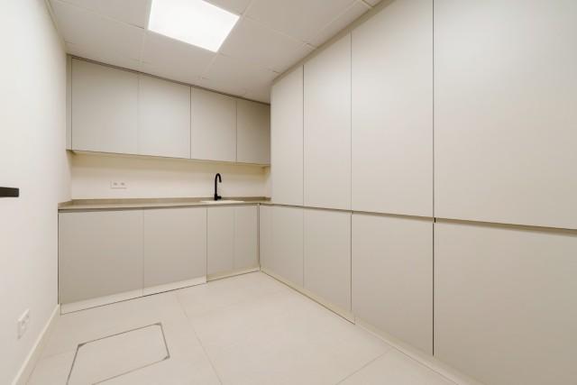 Binnen is de sfeer licht en luchtig, met kamerhoge ramen, neutrale tinten en elegante inbouwverlichting die het gevoel van ruimte versterken. De open woon- en eetkamer is voorzien van een op maat gemaakte tv-wand en loopt naadloos over in de ultramoderne keuken, compleet met een warm houten kookeiland, hoogwaardige inbouwapparatuur en strakke kasten – de perfecte mix van design en functionaliteit.