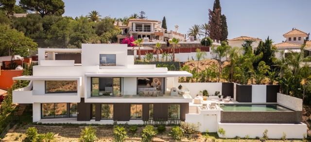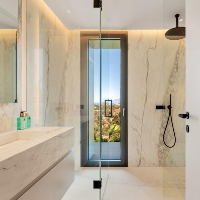 Binnen is de villa hoogwaardig afgewerkt met elegante stenen oppervlakken, warme houten kasten en discrete verlichting. Ruime slaapkamers hebben prachtige en-suite badkamers, terwijl de master suite directe toegang tot het terras en een panoramisch zeezicht biedt. Met zijn moderne design, privacy en uitzonderlijke vergezichten is deze woning een opvallende, moderne woning in Marbella Oost.
