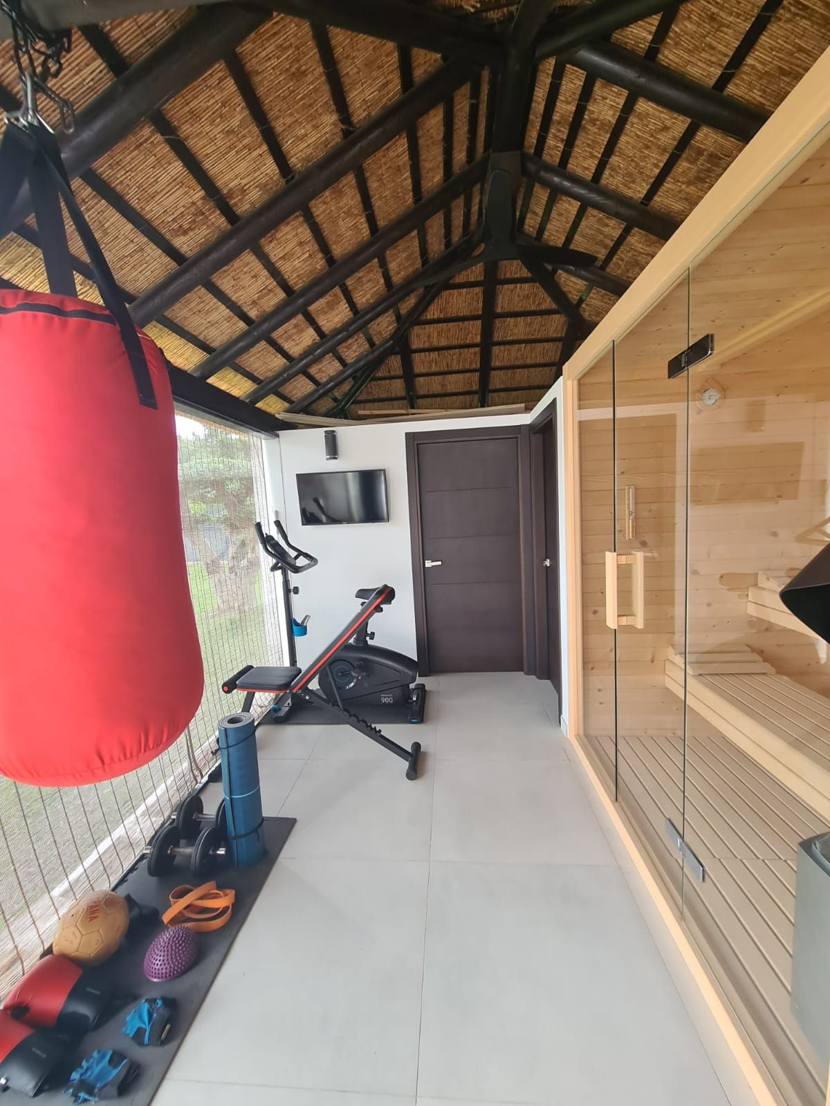 Wooden gazebo with thatched roof with a summer kitchen and dining area
