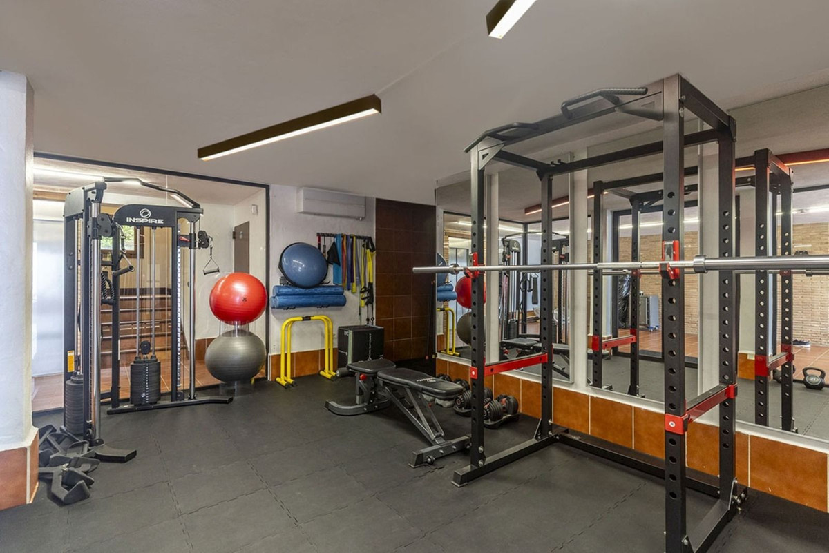 From the kitchen, there is access to a large laundry room with space for a washing machine, two dryers, and ample storage capacity. The property also includes a modern private gym next to the garage, a storage room, and a workshop area, optimizing space usage.