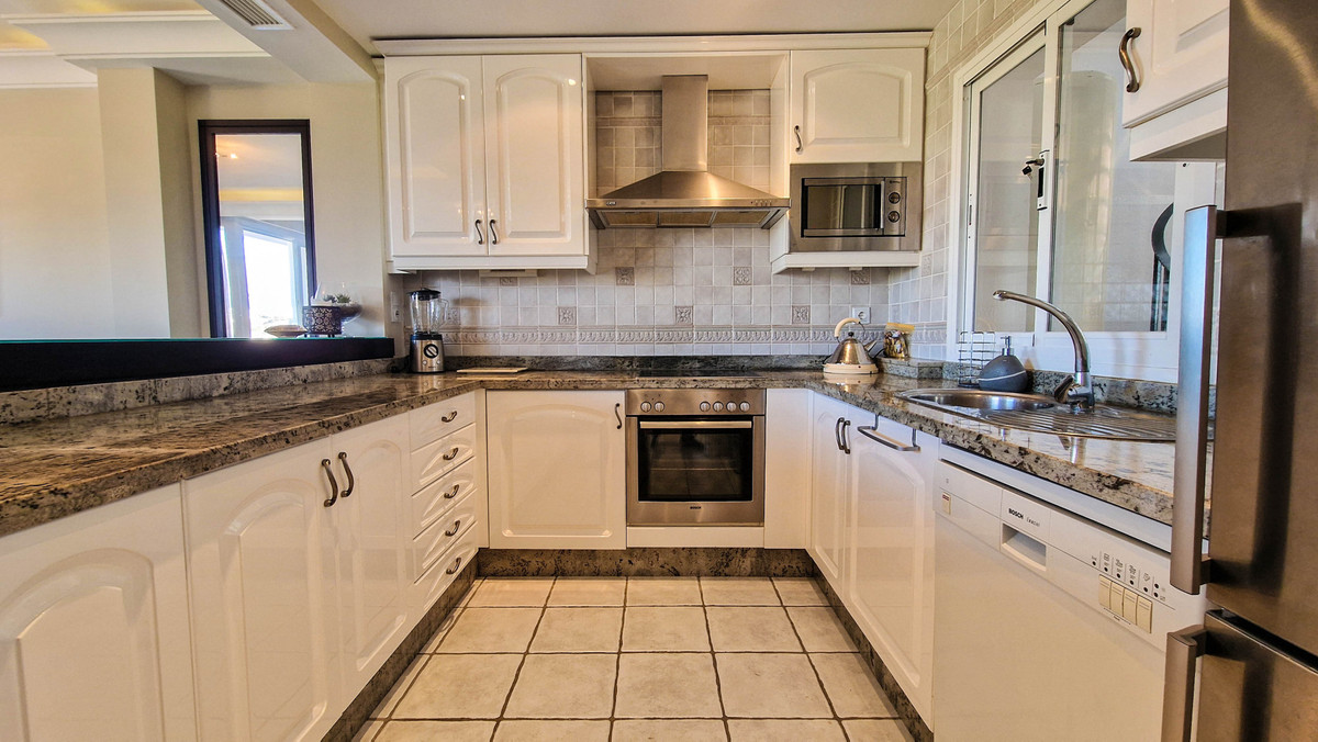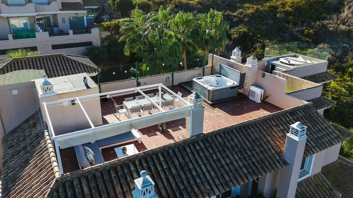 De open woonkamer loopt vloeiend over in een privéterras, waar u een panoramisch uitzicht heeft over het landschap en de omgeving. Een indrukwekkend solarium biedt extra buitenruimte – ideaal om gasten te ontvangen of te ontspannen – compleet met een buitenkeuken en jacuzzi om in alle privacy te genieten van de warme Spaanse avonden. Daarnaast kunt u genieten van gemeenschappelijke zwembaden in weelderige, goed onderhouden tuinen verspreid over de urbanisatie.