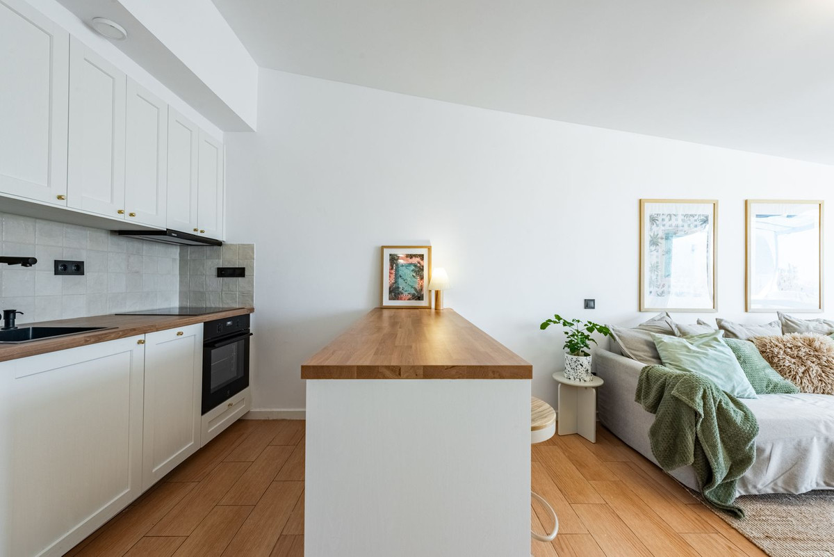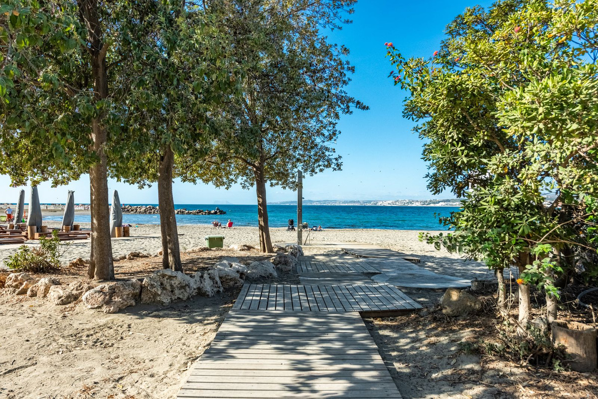 Het appartement bevindt zich een halve verdieping hoger en is gelijkvloers. Het beschikt over een ruime slaapkamer met inbouwkasten, een badkamer en een hal die leidt naar een stijlvolle open keuken en woonkamer. Vanuit de woonkamer stapt u uit op het zonnige terras op het zuiden met prachtig uitzicht op zee – de perfecte plek om te ontspannen, te dineren en het hele jaar door van de zon te genieten. Voor wie dat wenst, is er tegen een kleine vergoeding toegang tot een heerlijk gemeenschappelijk zwembad, ideaal tijdens de warme zomermaanden.