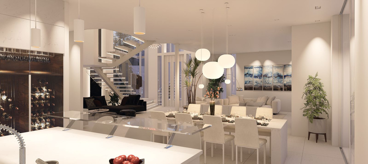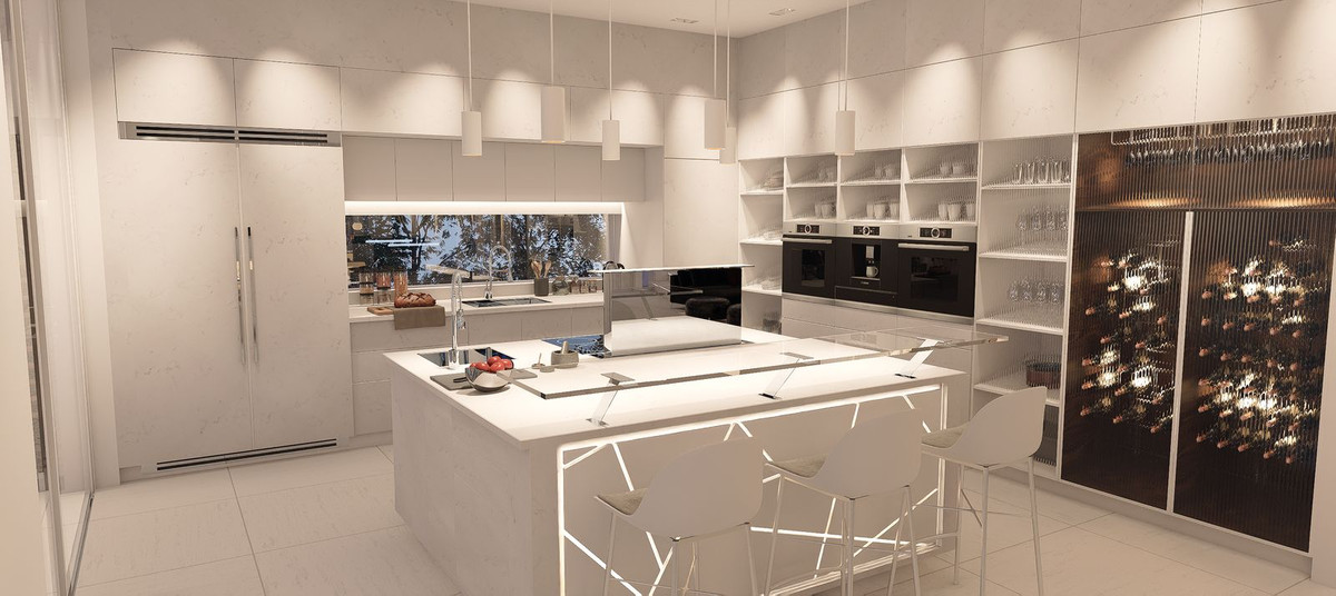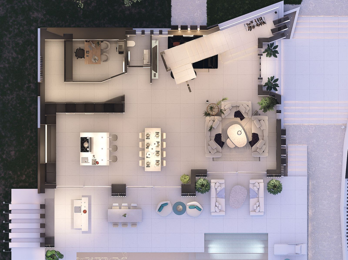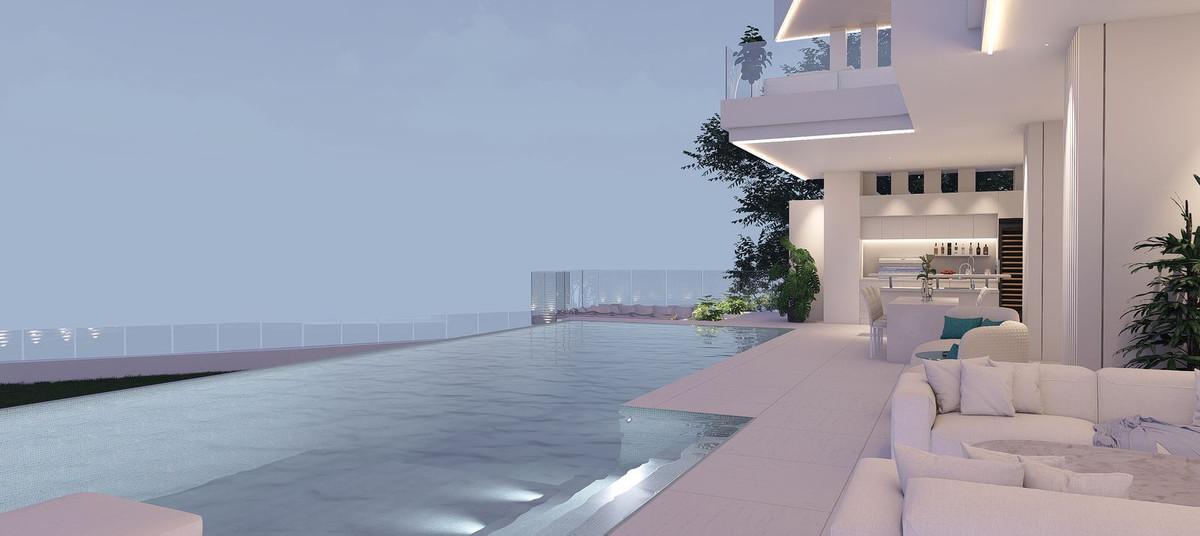 Het ontwerp van het huis is zorgvuldig gepland om ruimte en comfort te bieden. Het beschikt over drie slaapkamers in suite-stijl, binnen- en buitenkeukens, een studeerkamer, een fitnessruimte, recreatieruimtes op het dak, een terras en een groot zwembad om baantjes te trekken. De kelder is ook geschikt voor een extra slaapkamer of studeerkamer.