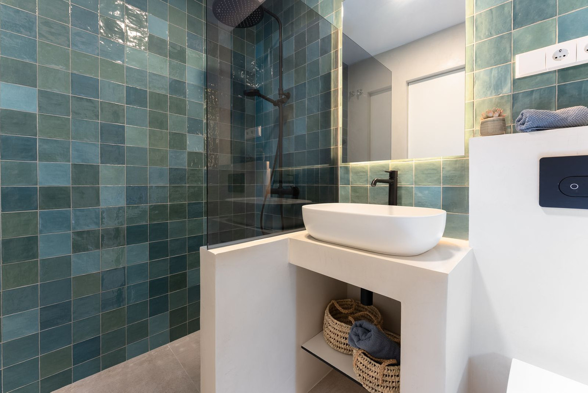 De tweede slaapkamer en de bijbehorende badkamer bevinden zich een verdieping lager en bieden volledige privacy, elektrische rolluiken en veel opbergruimte.
