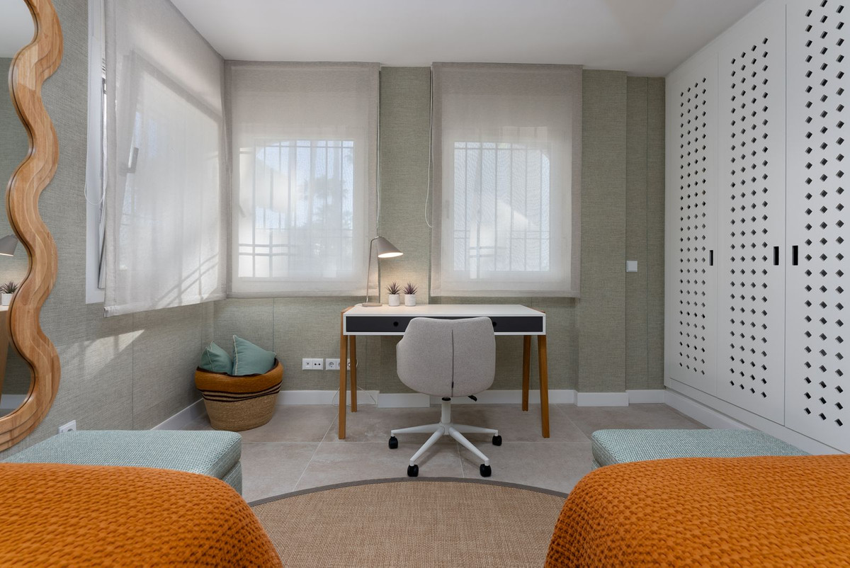 Het appartement is volledig gerenoveerd tot een hoge standaard, inclusief alle elektrische en sanitaire voorzieningen, design badkamers met vloerverwarming, een moderne keuken met Siemens apparatuur, grote porseleinen tegelvloeren van het prestigieuze merk Porcelanosa en twee ruime slaapkamers. Het beschikt over twee terrassen, één op de verdieping van de woon-/eetkamer en de open keuken en één op de verdieping met een solarium, met een onovertroffen uitzicht op zee en absolute privacy. Er is een design houten pergola met een gemotoriseerd zonnescherm en windsensor geïnstalleerd. De zonsondergangen laten niemand onverschillig.