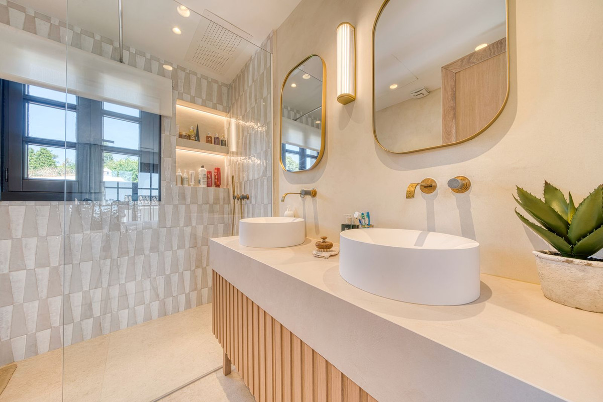 U betreedt dit prachtige huis via een zonovergoten binnenplaats, ideaal om buiten te dineren, en stapt binnen in een woning waar elk detail zorgvuldig is samengesteld. De begane grond is prachtig afgewerkt en beschikt over een designkeuken met Gaggenau-apparatuur, een kookeiland en een royale eethoek. De open woonkamer wordt omlijst door gekalkte eikenhouten plafondbalken en extra grote schuifdeuren die leiden naar een ruim terras, dat de ruimte overspoelt met licht en binnen- en buitenleven met elkaar verbindt. Beneden, op de benedenverdieping, draait alles om comfort en entertainment, met een privébioscooplounge met een extra grote bank, een tweede keuken met bar, een wijndisplay en twee prachtig ingerichte gastensuites, elk met een eigen badkamer en toegang tot een overdekt terras. Boven is de master suite een oase van rust met een kleedkamer, een complete en-suite badkamer en een prachtig vrijstaand bad. Een vierde slaapkamer maakt de verdieping compleet, ideaal voor een gezin of extra gasten.