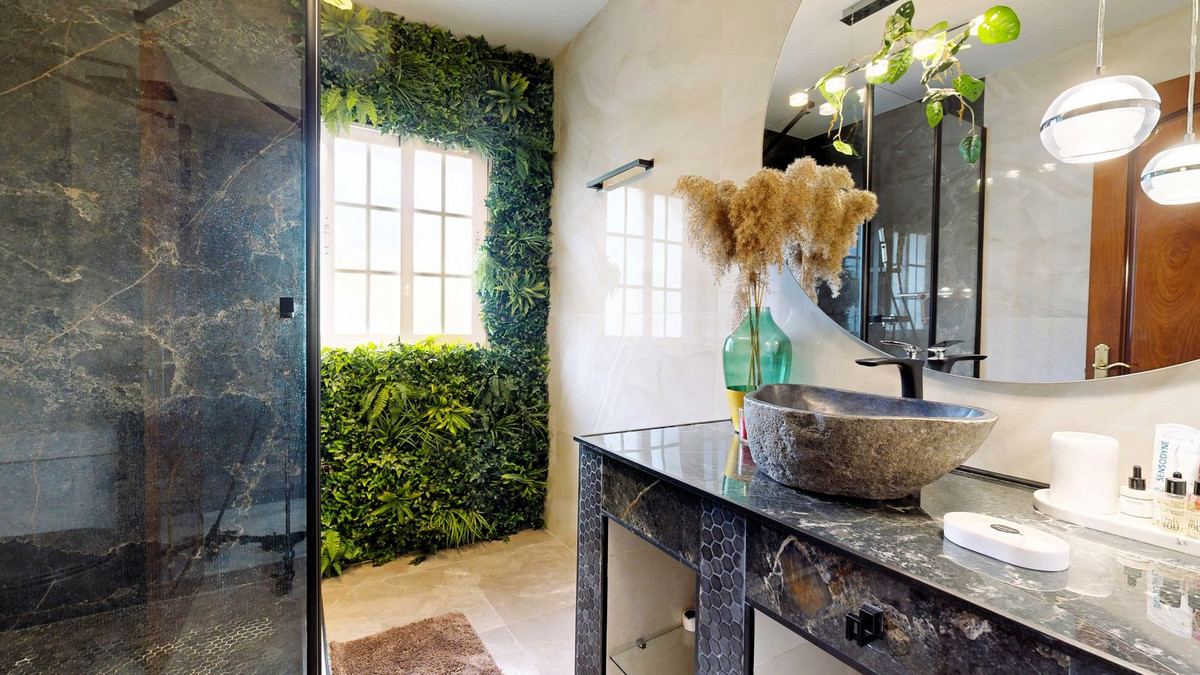 Vanaf dit niveau heeft u direct toegang tot de privétuin met een groot zwembad, omgeven door weelderig groen. Ideaal om te zonnebaden of om buiten samen te komen.