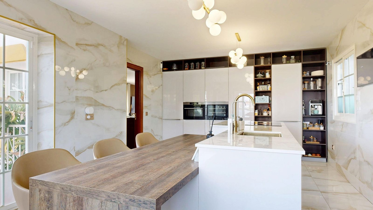 De spectaculaire woonkamer is gevuld met natuurlijk licht en grenst aan een elegante eethoek en een moderne open keuken met kookeiland. Deze keuken is volledig uitgerust en ontworpen voor optimaal genot voor het hele gezin.