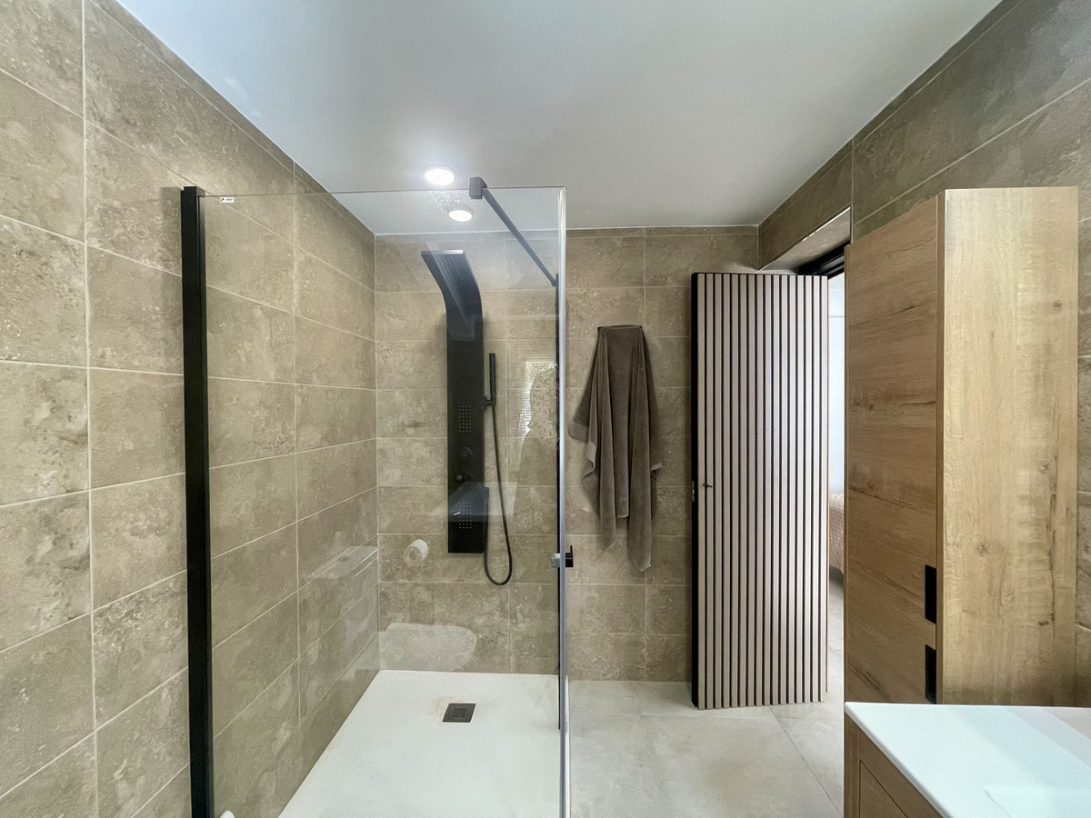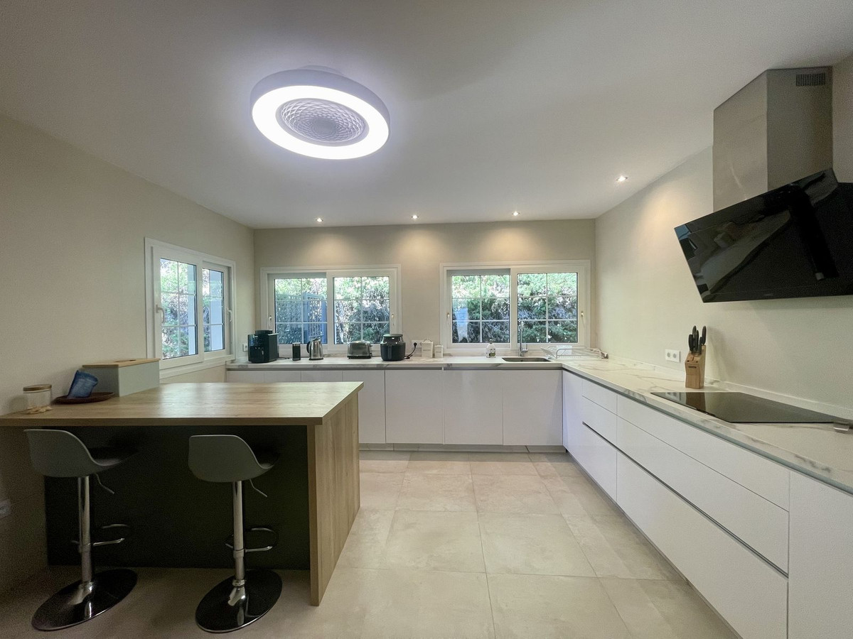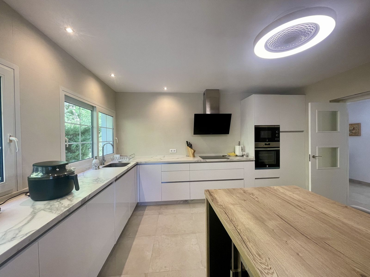 Het huis beschikt over drie slaapkamers en twee badkamers, waarvan de bijzonder ruime hoofdslaapkamer een ensuite badkamer heeft, terwijl de overige twee slaapkamers een familiebadkamer delen. De woon- en eetkamer is ruim en baadt in het natuurlijke licht, wat een gezellige centrale ruimte creëert om te ontspannen of gasten te ontvangen. De keuken is volledig uitgerust met hoogwaardige apparatuur, waaronder een geïntegreerde wijnkoeler, en biedt directe toegang tot de tuin.
