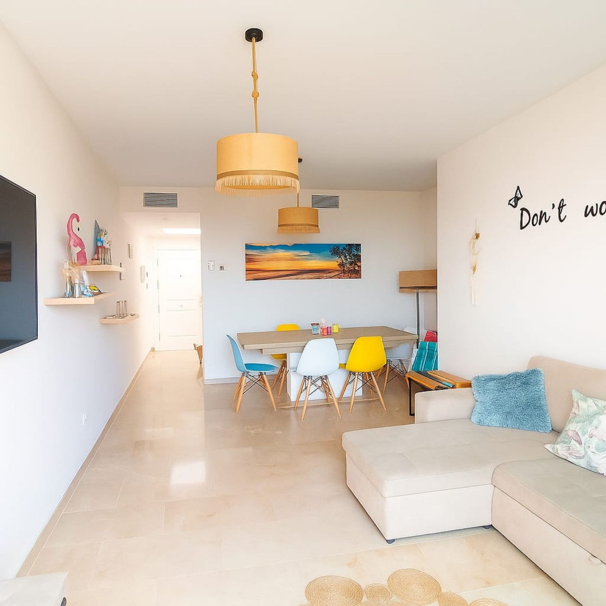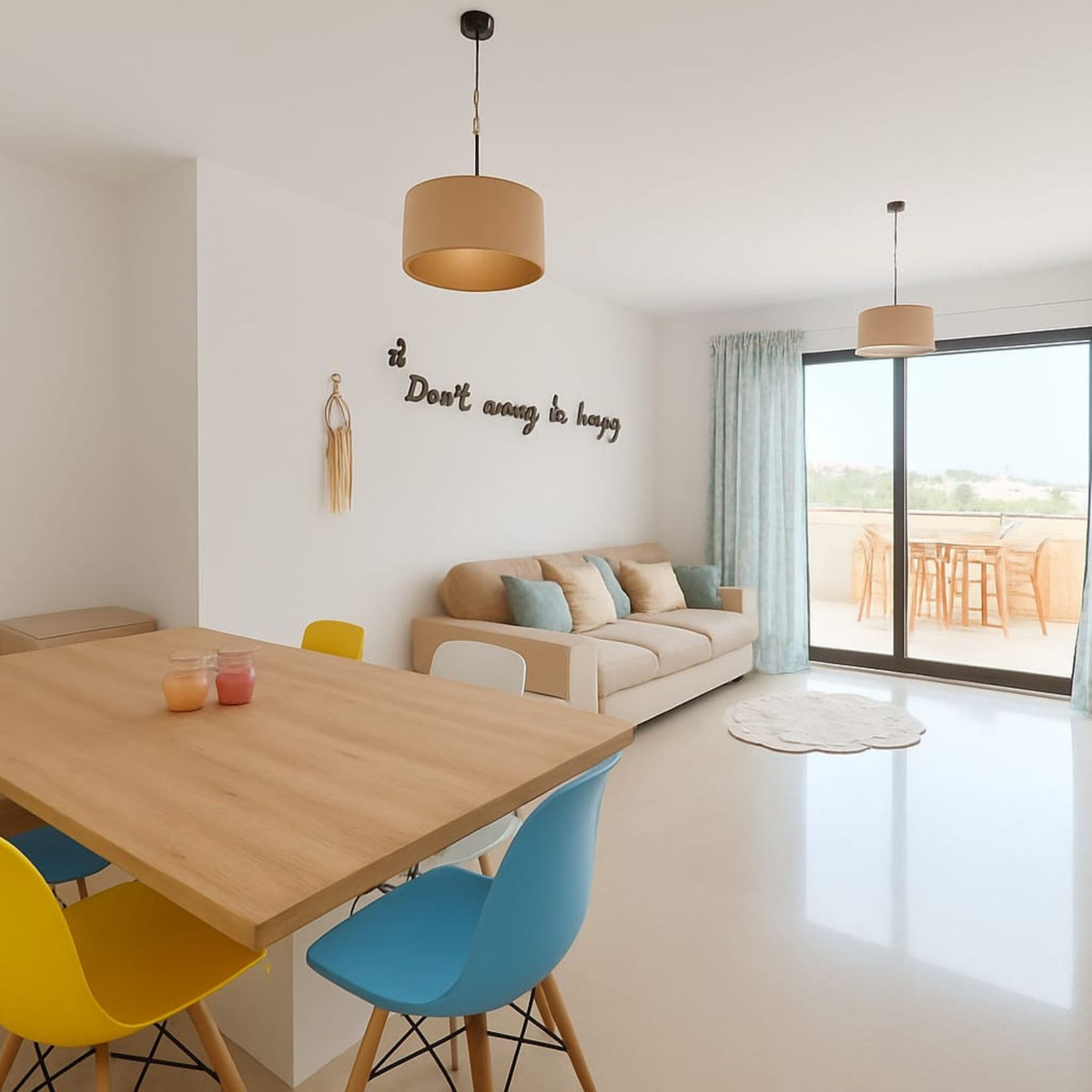 Het appartement onderscheidt zich door zijn ruimtelijkheid, natuurlijke lichtinval en functionele design, en biedt de perfecte indeling om te genieten van de mediterrane levensstijl. Het beschikt over twee ruime slaapkamers, beide met directe toegang tot de terrassen, twee complete badkamers, een volledig uitgeruste keuken met hoogwaardige apparatuur en een lichte woon- en eetkamer met grote ramen die uitkomen op een privéterras. Deze buitenruimte is perfect om te ontspannen in de zon, te genieten van een diner in de buitenlucht of te genieten van de adembenemende zonsondergangen over de tuinen en de zee.