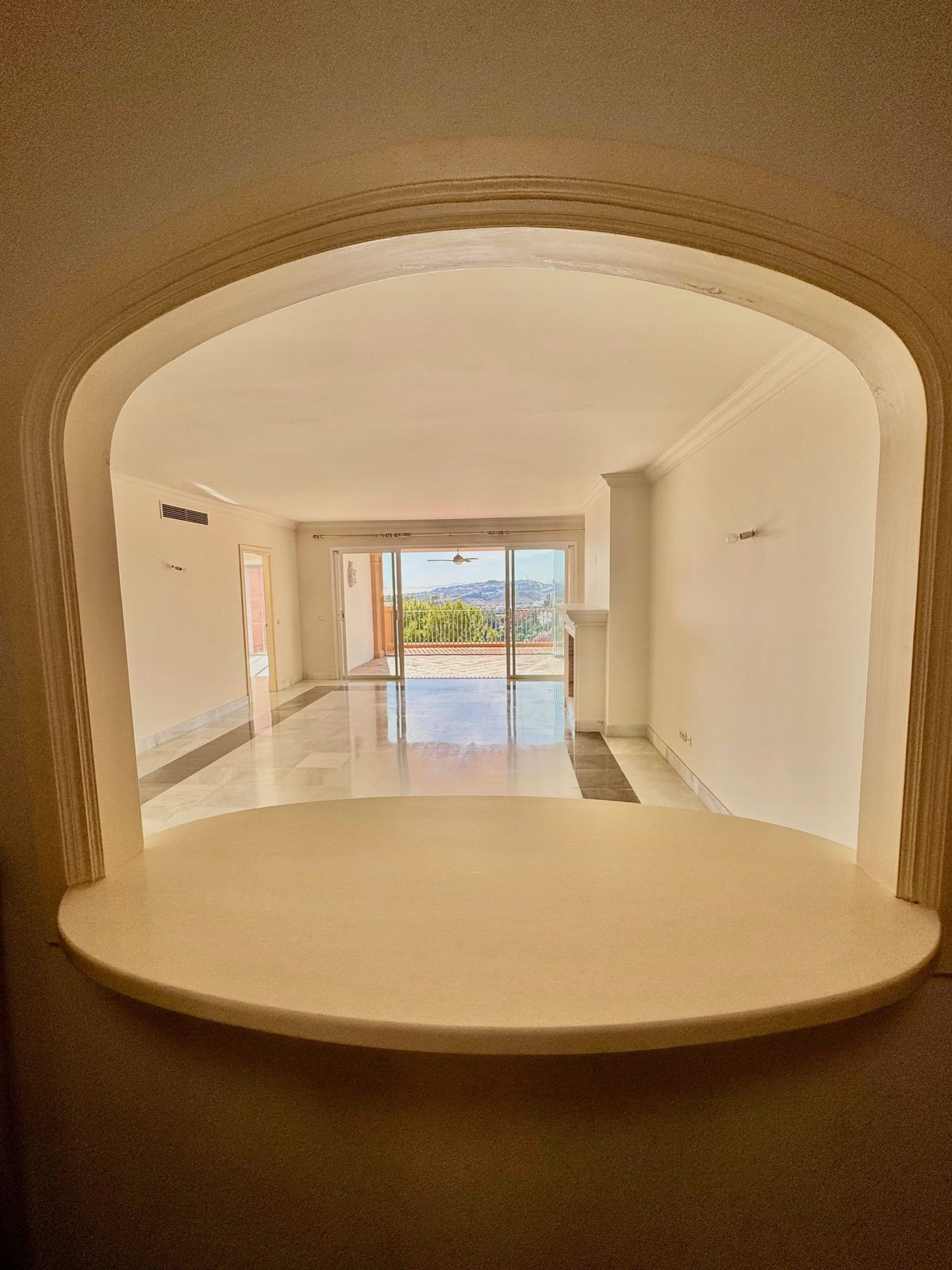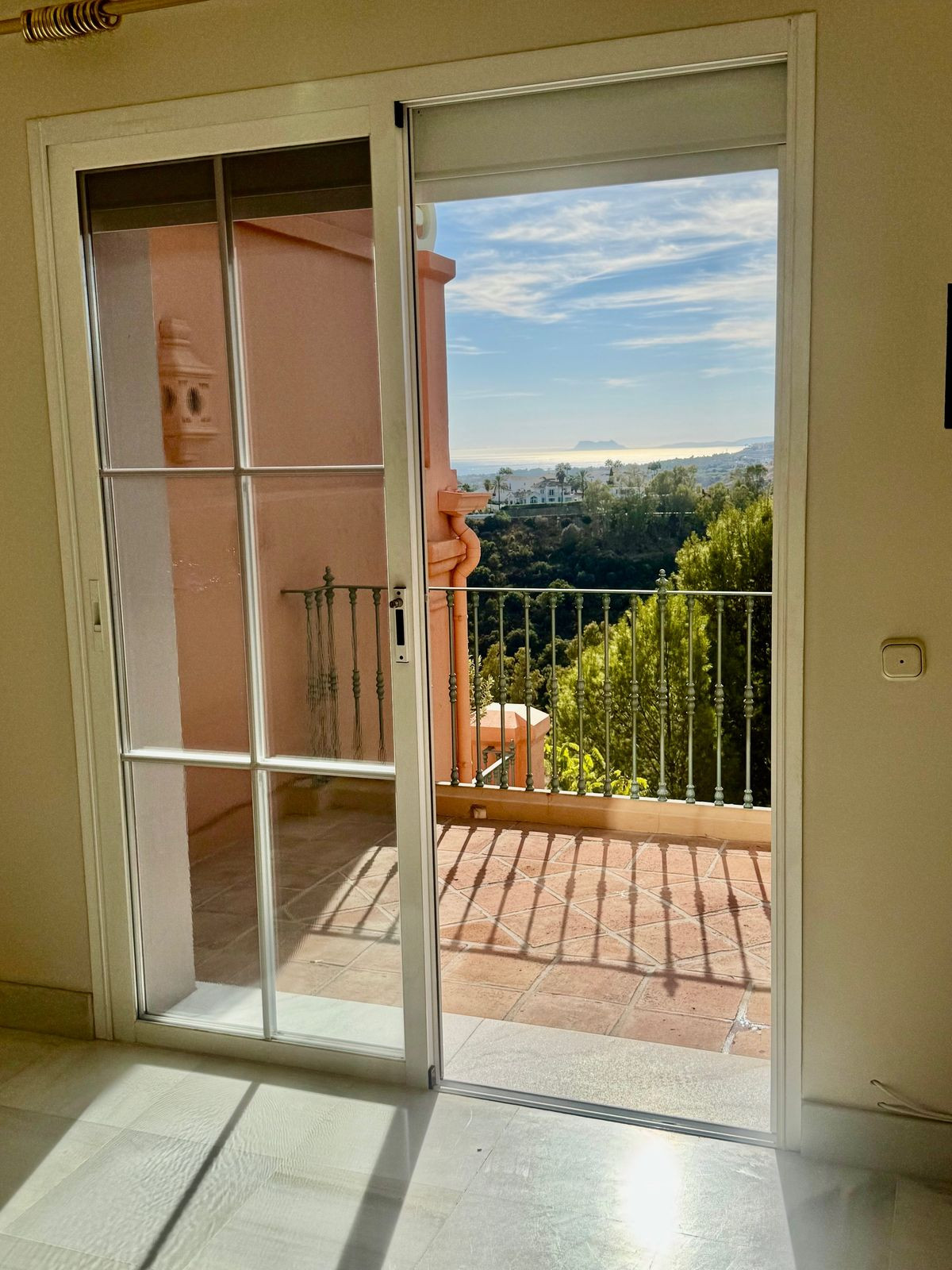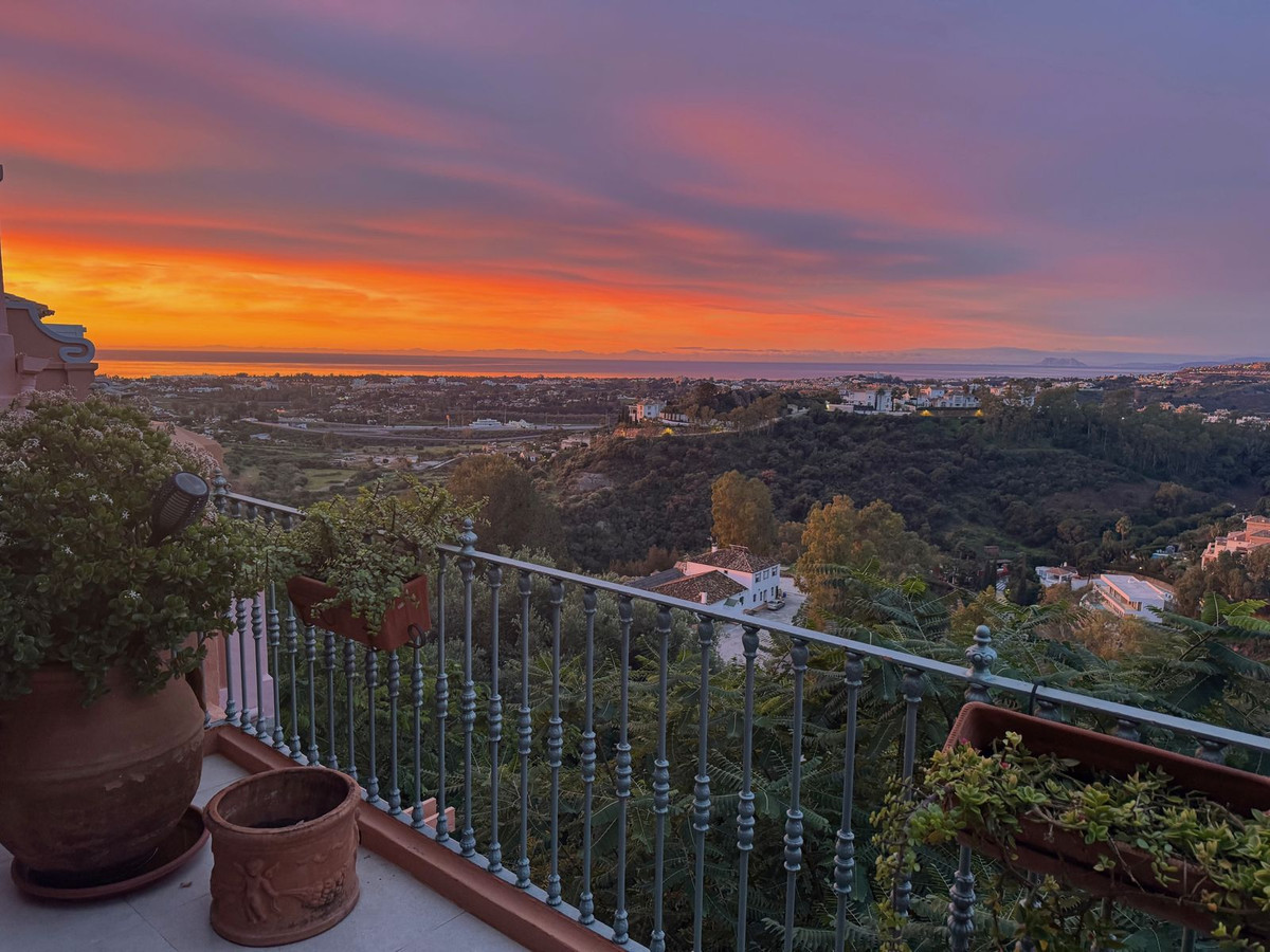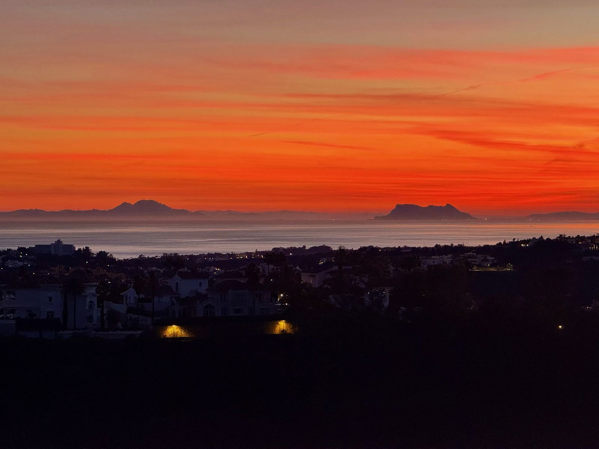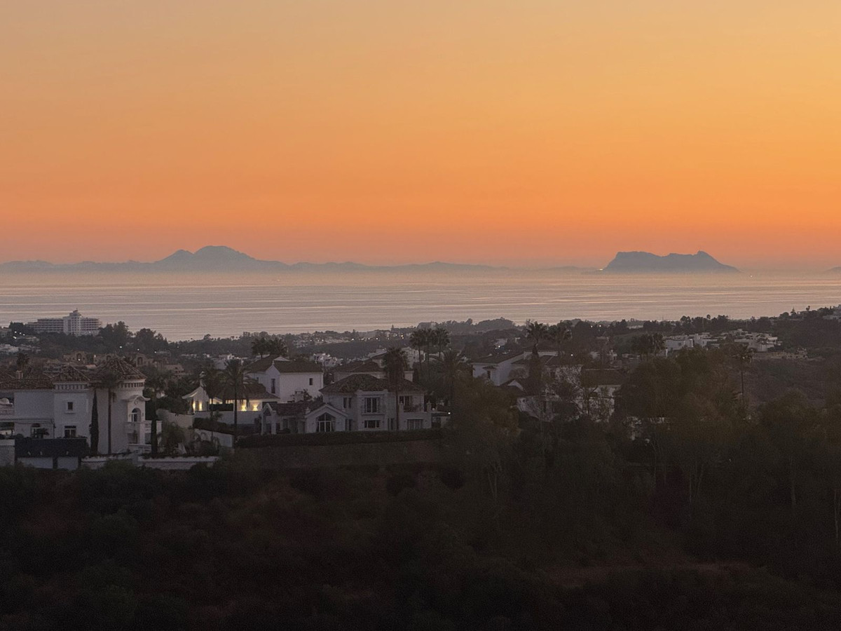 Bij de ingang loopt u een paar treden op die naar de voordeur leiden. Bij binnenkomst wordt u begroet door een ruime en lichte eet- en woonkamer, geaccentueerd door kamerhoge ramen die een uitnodigende sfeer creëren. Stap naar buiten op uw ruime overdekte terras van 22 m², voorzien van glazen gordijnen, zodat u kunt genieten van het adembenemende panoramische uitzicht over de omgeving van Benahavís, de majestueuze nabijgelegen bergen, de iconische Rots van Gibraltar en de sprankelende zee. Het prachtige open uitzicht op het zuidwesten biedt het hele jaar door een gevoel van comfort voor geest en ziel; op heldere dagen kunt u zelfs een glimp opvangen van de Afrikaanse kust en het Atlasgebergte – werkelijk adembenemend! De zonsondergangen vanaf hier zijn spectaculair.