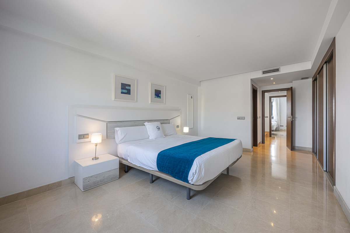 Het duplex penthouse biedt een ruime woonkamer met directe toegang tot een van de terrassen met open en gedeeltelijk uitzicht op zee. De keuken is geïntegreerd in de woonkamer, maar tegelijkertijd enigszins afgescheiden en is volledig ingericht met hoogwaardige apparatuur. De hoofdslaapkamer heeft een eigen badkamer en inbouwkasten. Op deze verdieping bevindt zich ook een logeerkamer met twee eenpersoonsbedden en een externe badkamer. Boven is er een slaapkamer met een kledingkast die directe toegang biedt tot het grote solarium met open uitzicht op de boulevard en gedeeltelijk uitzicht op zee. De woning beschikt over twee parkeerplaatsen.