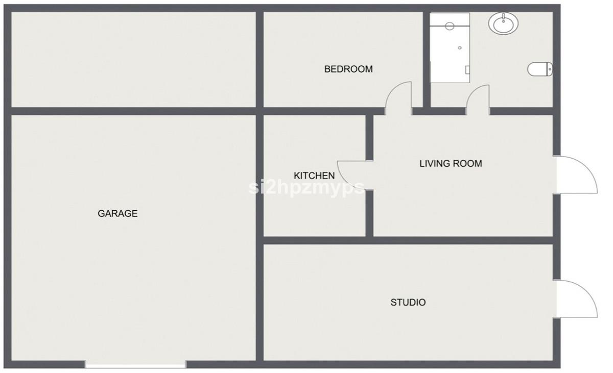 Hier vindt u een grote garage met ruimte voor twee auto's, een studio met douche en toilet en een keuken. Direct naast de studio bevindt zich nog een apart appartement met een slaapkamer, badkamer en keuken. Via de garage leidt een trap naar de bovenverdieping en de hoofdwoning, die ook bereikbaar is via de hoofdingang aan de andere kant van het huis.