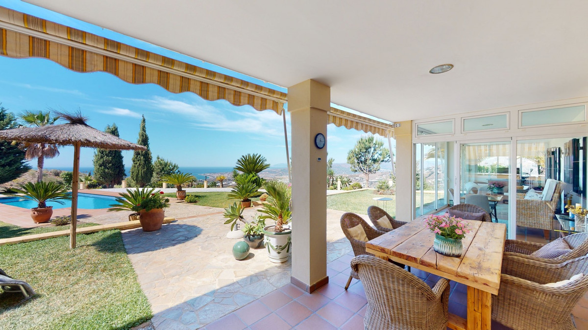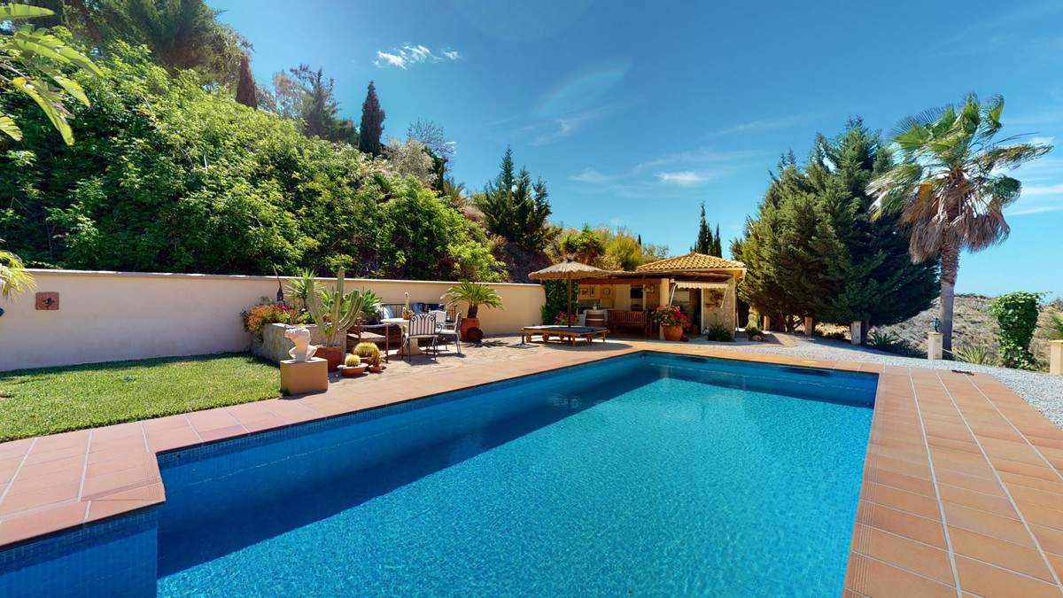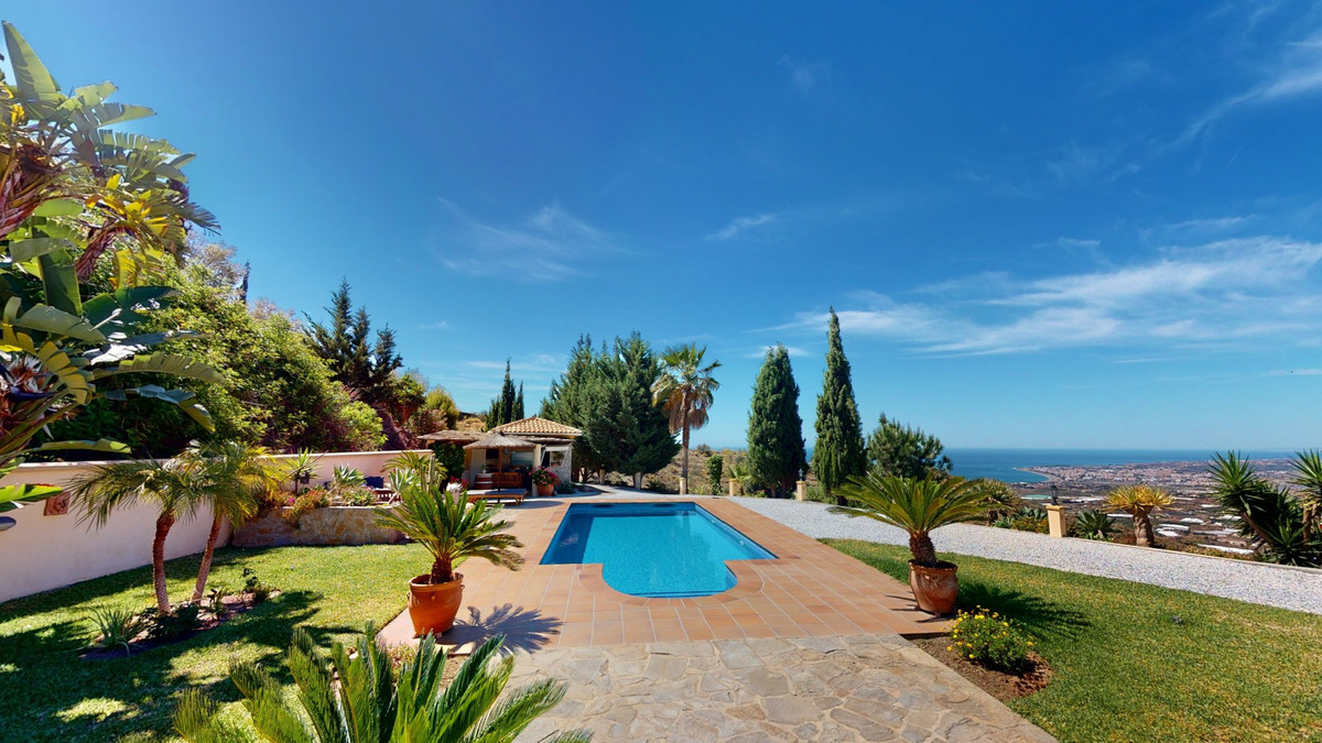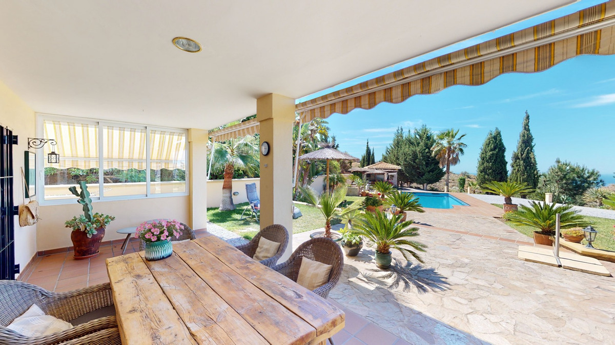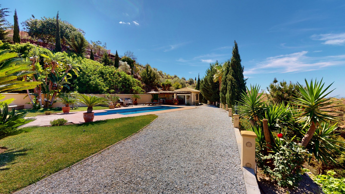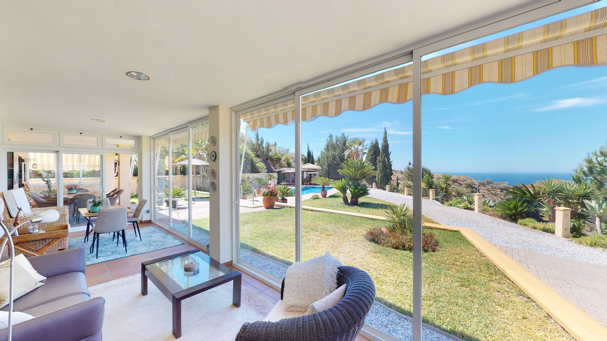 Het perfecte uitzicht gecombineerd met de perfecte zuidwestelijke oriëntatie, samen geven ze de ultieme kans op absoluut geluk. Een villa die niets te wensen overlaat, gebouwd volgens een zeer hoge standaard met een onvergelijkbaar mooie tuin met spa, sauna en zwembad, een luxe buitenkeuken met geïntegreerde eethoek. Dit alles en meer biedt deze unieke villa, gelegen tussen Algarrobo en Sayalonga. Door de gunstige ligging heeft u naast absolute privacy ook een romantisch uitzicht op de ondergaande zon - deels over de Middellandse Zee en soms - afhankelijk van het seizoen - over het fantastische berglandschap van Málaga. Via een geasfalteerde, met pijnbomen omzoomde privé-toegangsweg bereikt u de imposante entree van het pand, waar zich een palmeneiland bevindt te midden van rondel. Er zijn diverse parkeerplaatsen en een garage plus een grote carport. Op de eerste verdieping van de villa bevinden zich de woonkamer met aparte open haard, een gastentoilet en wasruimte, een moderne keuken met toegang tot de zeer ruime serre, waar het aan niets ontbreekt. Verder bevindt zich op de eerste verdieping een zeer mooie slaapkamer met een badkamer en suite. Op de bovenverdieping van de villa bevindt zich de hoofdslaapkamer met een ruime en-suite badkamer en een aangrenzende kleedkamer. De woning is voorzien van centrale verwarming, airconditioning en een open haard. Op het perceel staan diverse fruitbomen, palmbomen, tropische planten en pijnbomen. Het strand en de zee liggen op 15 minuten afstand, evenals de golfbaan en jachthaven van Caleta - en de luchthaven van Malaga is in slechts 40 minuten te bereiken. We zijn verheugd u binnenkort deze droomwoning te kunnen presenteren, persoonlijk of via een virtuele bezichtiging. Want deze wereld is uniek - net als onze Axarquía. In Andalusië. Aan de Costa del Sol. Hier, aan de zonnige kant van het leven...