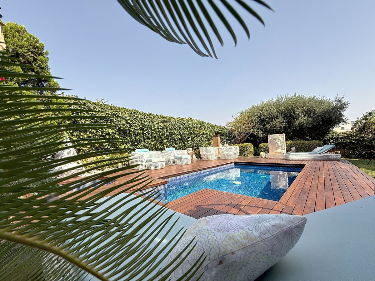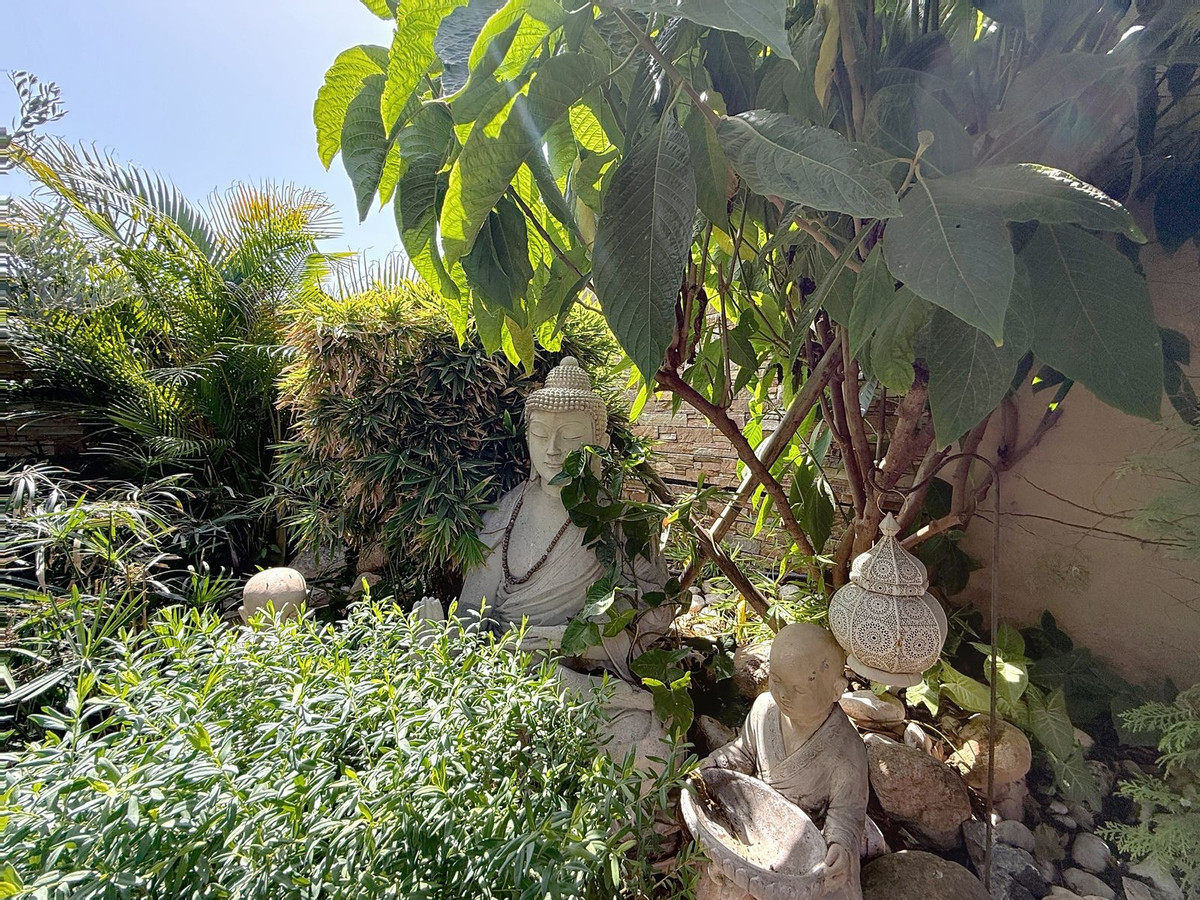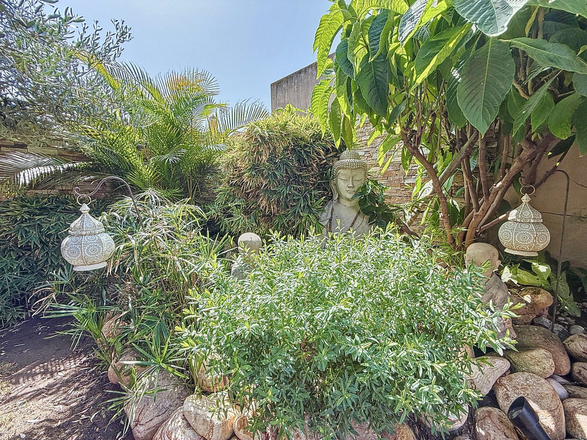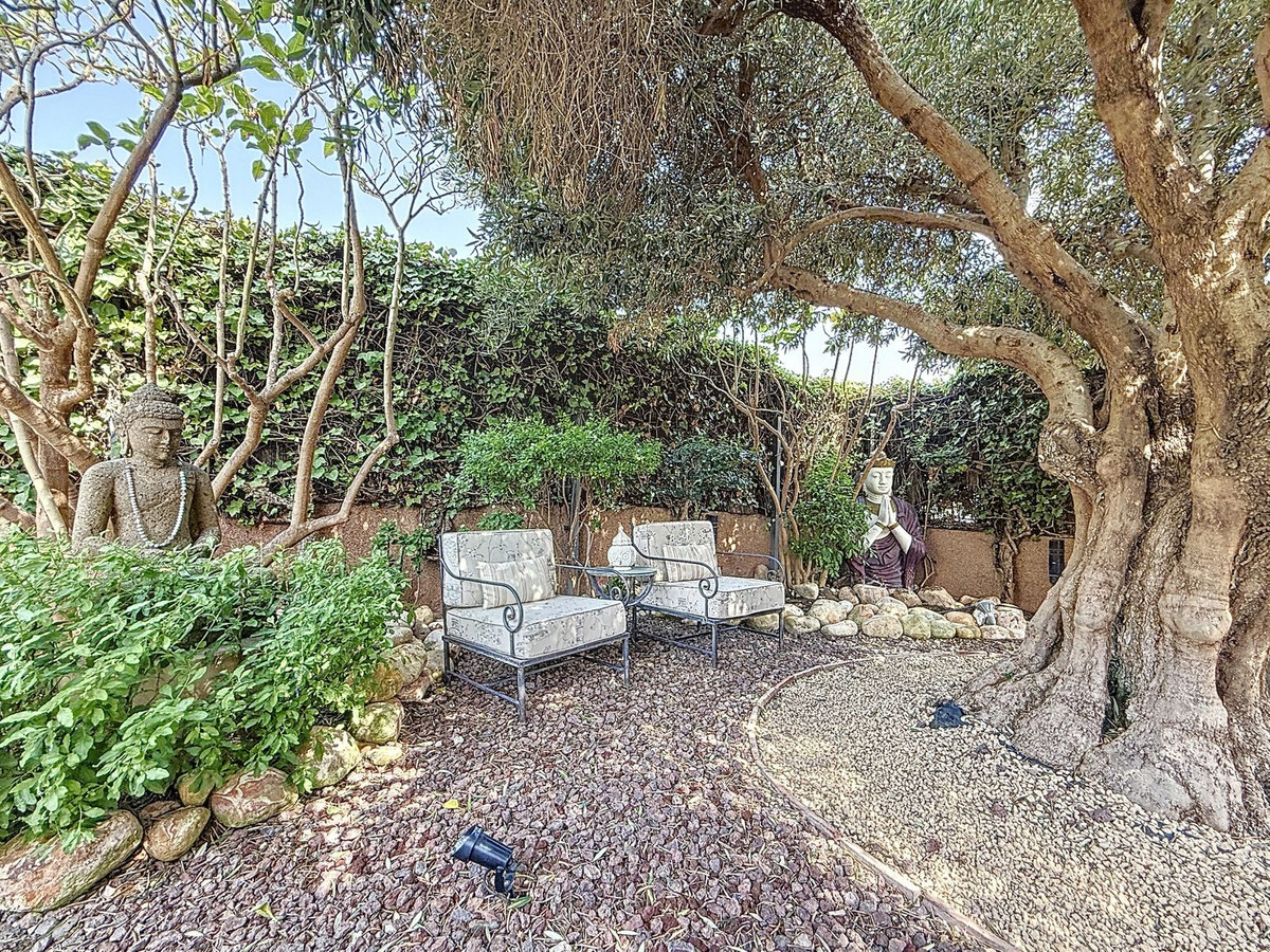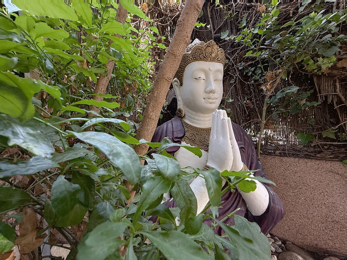 Vanaf het moment dat u door de privépoort stapt, wordt u omringd door een gevoel van sereniteit. De tuinen zijn een wereld op zich: een eeuwenoude olijfboom als beschermer, Boeddha-accenten die een spirituele rust creëren, schaduwrijke terrassen en intieme loungehoekjes die uitnodigen tot pure ontspanning. In het hart ligt een zwembad van 6x4 meter met jacuzzi, omringd door natuurlijk groen en de rustgevende schaduw van volwassen bomen – een zeldzame oase op deze bevoorrechte locatie.