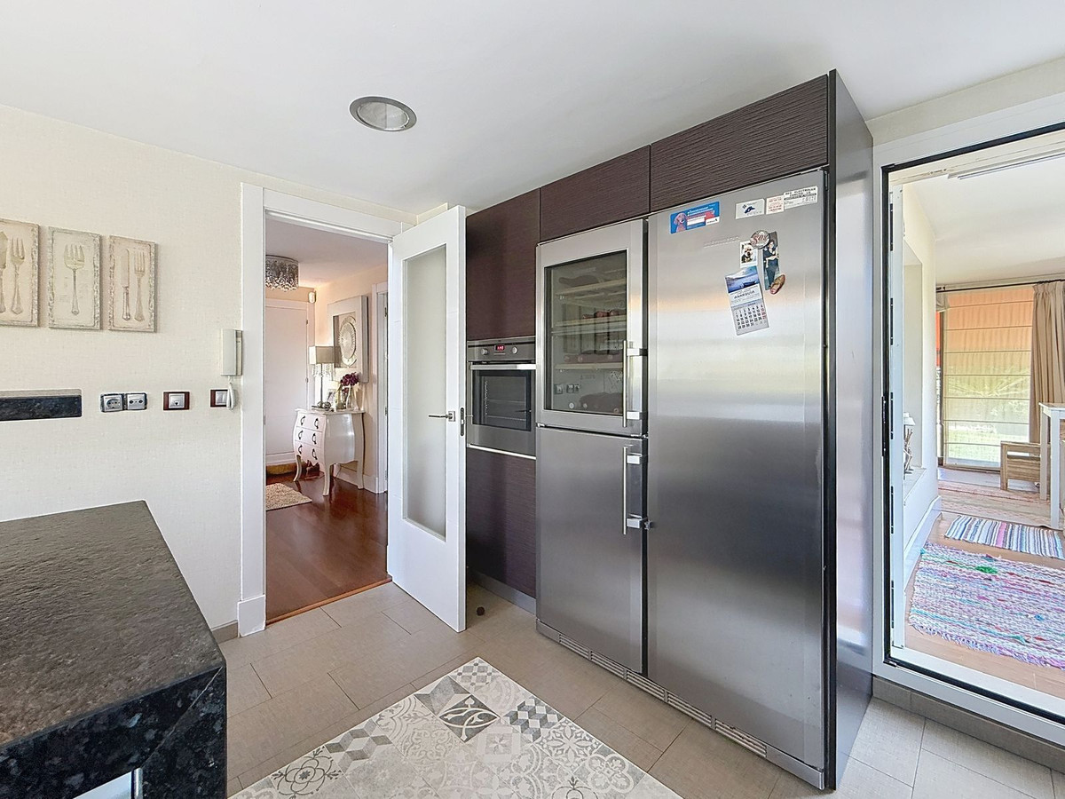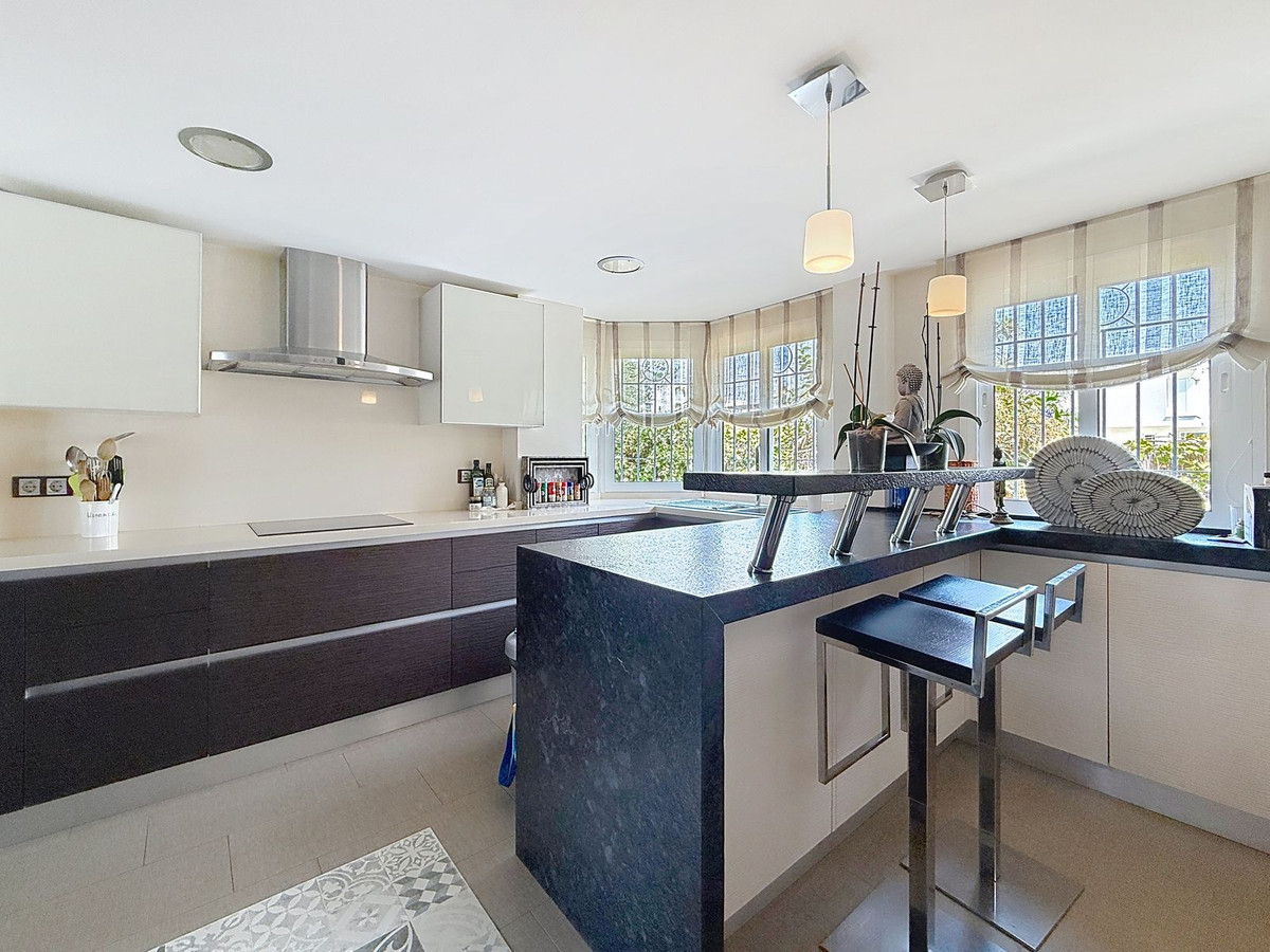 De villa verwelkomt u met een lichte hal en een apart gastentoilet, waarna u zich ontvouwt in elegante leefruimtes die baden in natuurlijk licht. De woon- en eetkamer, met een uitnodigende open haard en sierlijke boogramen, biedt uitzicht op de prachtige tuinen. De moderne keuken, afgewerkt met een keramische houtlookvloer, combineert een eigentijdse stijl met praktisch onderhoudsgemak.