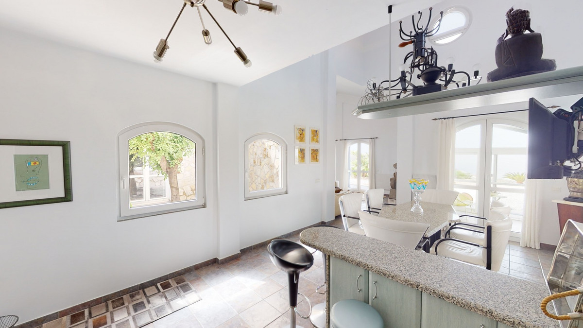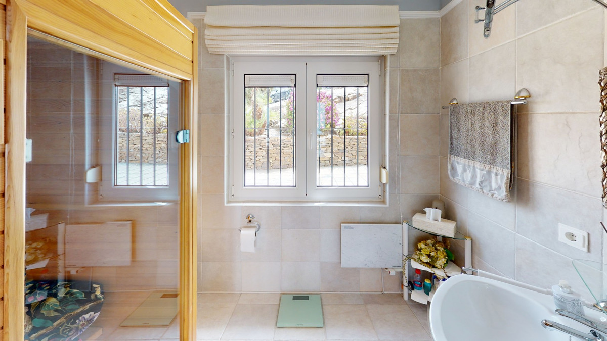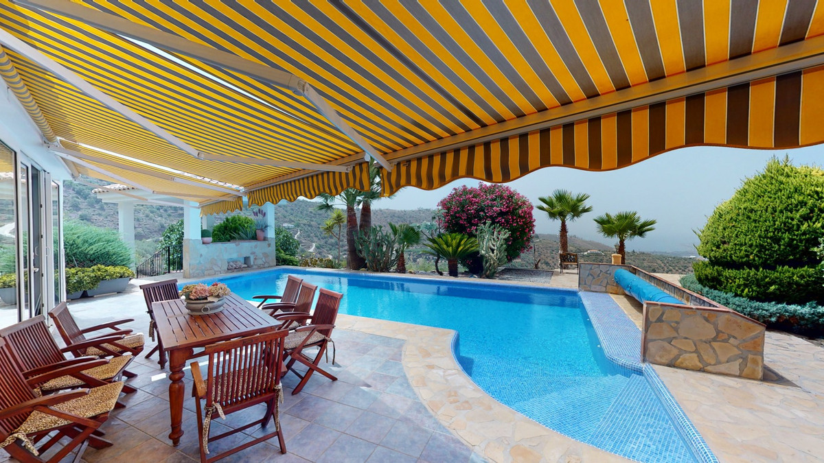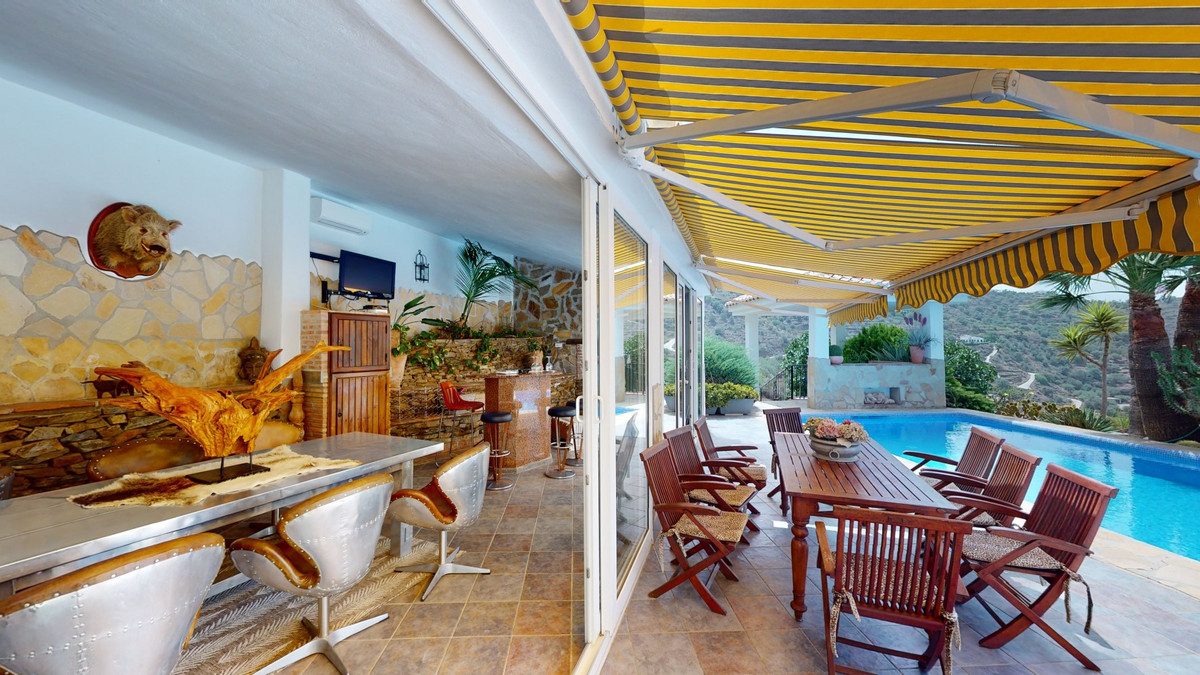 Droomt u ervan om te wonen in een fantastische, hoogwaardig gebouwde villa met een zwembad en een adembenemend uitzicht op zee? Dan bent u bij ons aan het juiste adres. Deze luxe villa van 280 m² biedt alles wat u zich maar kunt wensen. In het midden van de moderne villa, gemengd met Andalusische stijl, bevindt zich een charmante patio, die het huis een bijzonder accent geeft en zorgt voor prachtige lichtinval en sfeer. Deze patio verbindt het gehele benedengedeelte van de woning. Vanuit de entree leidt één kant naar een kamer die als kantoor wordt gebruikt, een slaapkamer met een en-suite badkamer en de ruime woonkamer met open haard en uitzicht op zee. Deze grenst aan de eetkamer en de keuken, van waaruit u de hal betreedt die verbonden is met de entree. Deze hal leidt ook naar de kleedkamer met een en-suite badkamer, waar zich een sauna bevindt. Een trap leidt vanaf de entree naar de tweede verdieping. Hier vindt u de grote hoofdslaapkamer met een en-suite badkamer en een wintertuin. Een buitentrap leidt naar de buitenruimte, die deze kamer een eigen ingang geeft. De prachtige buitenruimte biedt een dubbele garage en een wasruimte, die tevens als opslagruimte wordt gebruikt. Direct naast het uitnodigende zwembad bevindt zich een fitnessruimte met badkamer en een bijgebouw met glazen pui dat dienstdoet als loungeruimte met buitenkeuken. De perfecte plek voor feesten en diners met familie en vrienden. Op het perceel van 19.500 m² bevindt zich tevens een paddock met afdak en een eigen oprit voor het houden van paarden. Deze bevindt zich onder het huis. De oprit leidt tevens naar een kleine rijbak met drie paardenboxen, een zadelkamer en een douche voor de paarden. U heeft vrije ontwerpmogelijkheden voor het ruime perceel. Of het nu gaat om het aanleggen van een groente- en fruittuin, het uitbreiden van de paardenhouderij, het eventueel ombouwen van de rijbak tot een tennisbaan, volleybalveld of klein voetbalveld, of zelfs iets compleet nieuws. De keuze is geheel aan u. Wij zijn verheugd u binnenkort dit droomhuis te kunnen presenteren, persoonlijk of via een virtuele bezichtiging. Want deze wereld is uniek - net als onze Axarquía. In Andalusië. Aan de Costa del Sol. Hier, aan de zonnige kant van het leven...