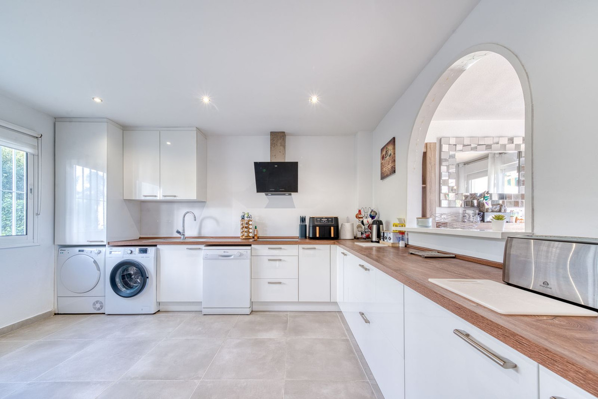 De begane grond beschikt over een gloednieuwe keuken met hoogwaardige apparatuur, strakke kasten en stenen werkbladen die op natuurlijke wijze overgaan in een lichte, ruime woonkamer. Grote nieuwe ramen vullen het interieur met natuurlijk licht en creëren een frisse, uitnodigende sfeer. Elk van de drie slaapkamers is voorzien van elegante inbouwkasten, terwijl de vernieuwde badkamers moderne armaturen, hoogwaardige afwerkingen en smaakvolle verlichting presenteren. De woning is volledig voorzien van airconditioning voor comfort het hele jaar door. Een opvallend kenmerk is de fotovoltaïsche zonne-installatie die zorgt voor lagere energiekosten en een doordachte, duurzame benadering van modern wonen weerspiegelt. De buitenruimtes zijn al even indrukwekkend met een privétuin, ideaal voor rustige ochtenden en ontspannen avonden, samen met een royaal dakterras met open uitzichten en een zeebriesje. Het grote gemeenschappelijke zwembad biedt een resort-achtige ervaring in een rustige woonwijk.