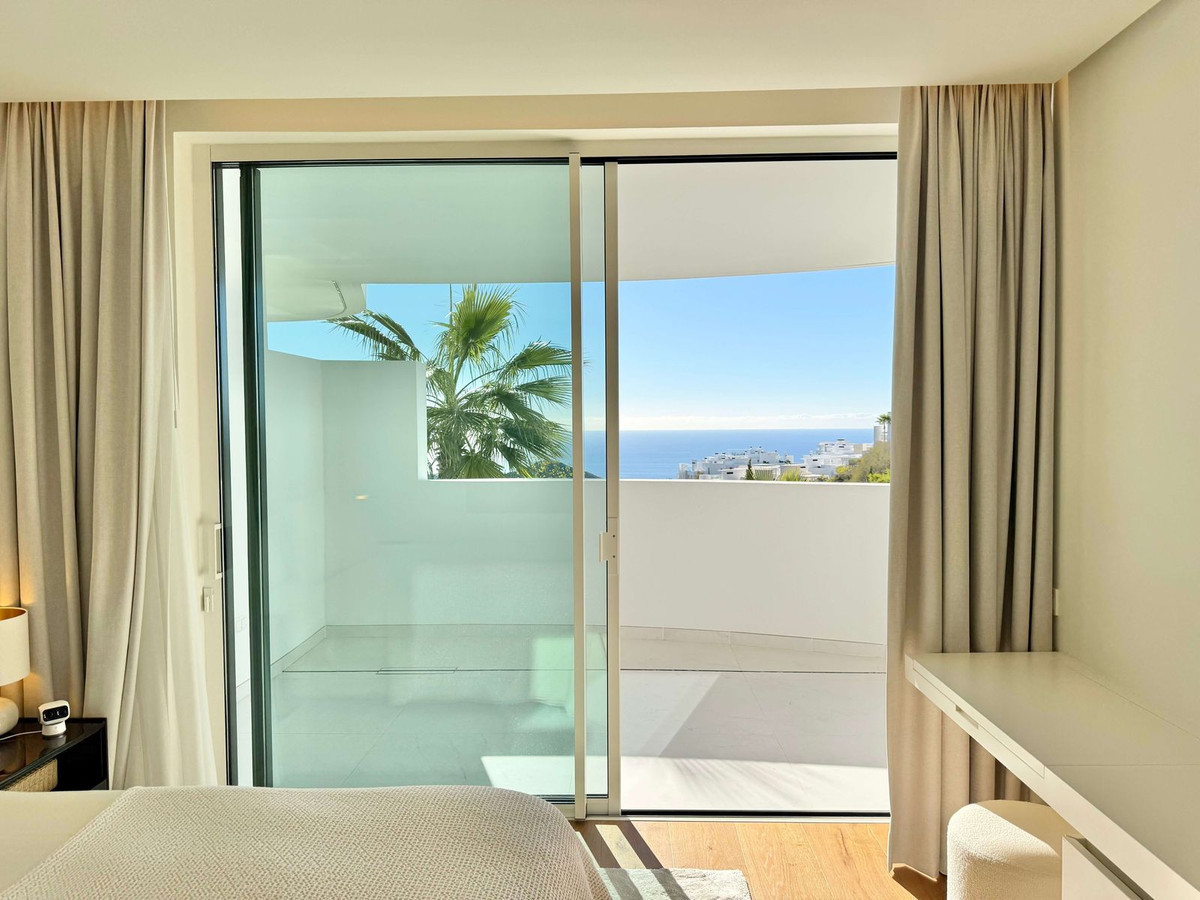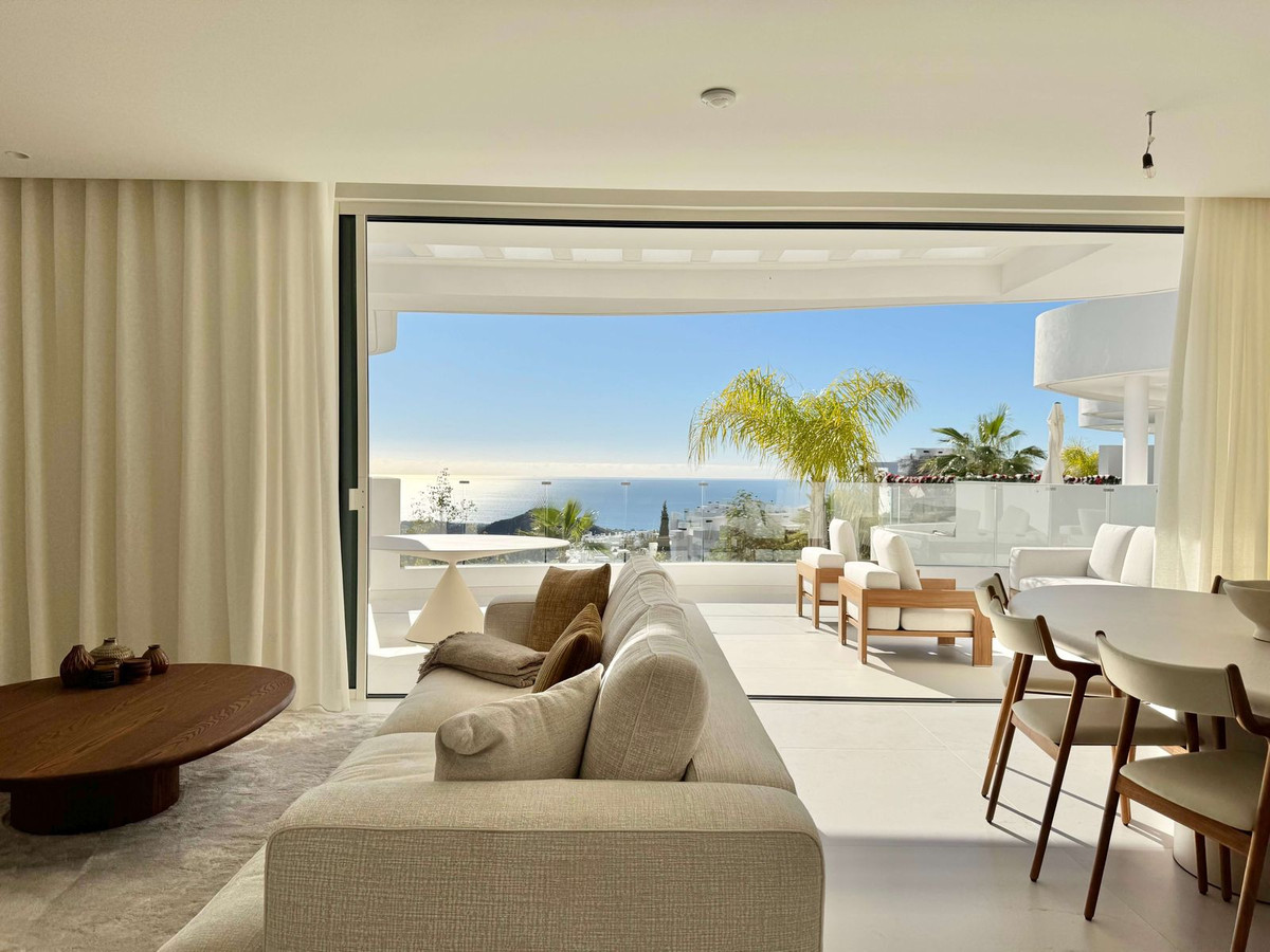 Dit ruime appartement met drie slaapkamers en twee badkamers is smaakvol ingericht in een warme, eigentijdse stijl. Grote ramen laten natuurlijk licht binnen in de woonruimtes en zorgen voor een naadloze verbinding met het grote terras met uitzicht op zee.