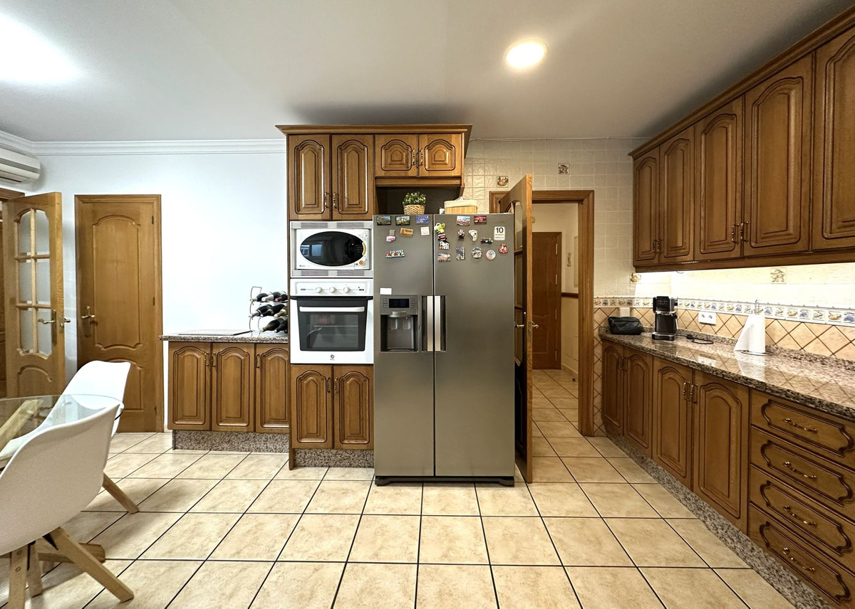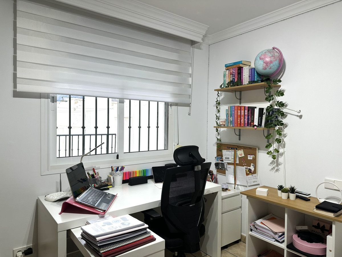 De woning bevindt zich op de tweede verdieping zonder lift, maar met een brede trap voor comfortabele toegang. Verdeeld over twee verdiepingen + dakterras, beschikt het op de eerste verdieping over een grote woon-/eetkamer met open haard, een zeer ruime, volledig uitgeruste keuken met wasruimte, pantry en een tafel voor 4 personen voor het geval u liever in de keuken eet, een kamer die momenteel als kantoor wordt gebruikt, een complete badkamer en een groot balkon met tafels en stoelen.