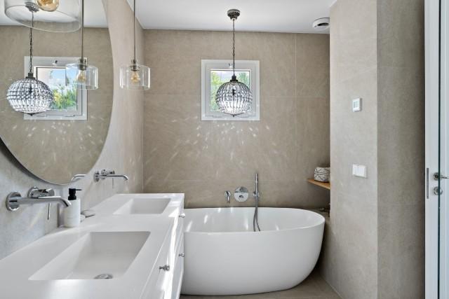 De begane grond heeft een elegante open indeling die een op maat gemaakte Scandinavische keuken verbindt met een ruime woon- en eetkamer. Grote deuren openen direct naar de privétuin, waar u een eethoek buiten, een ingebouwde barbecue en uw eigen ontspannende sauna vindt - perfect om van 's ochtends tot 's avonds te genieten van de levensstijl van Marbella.