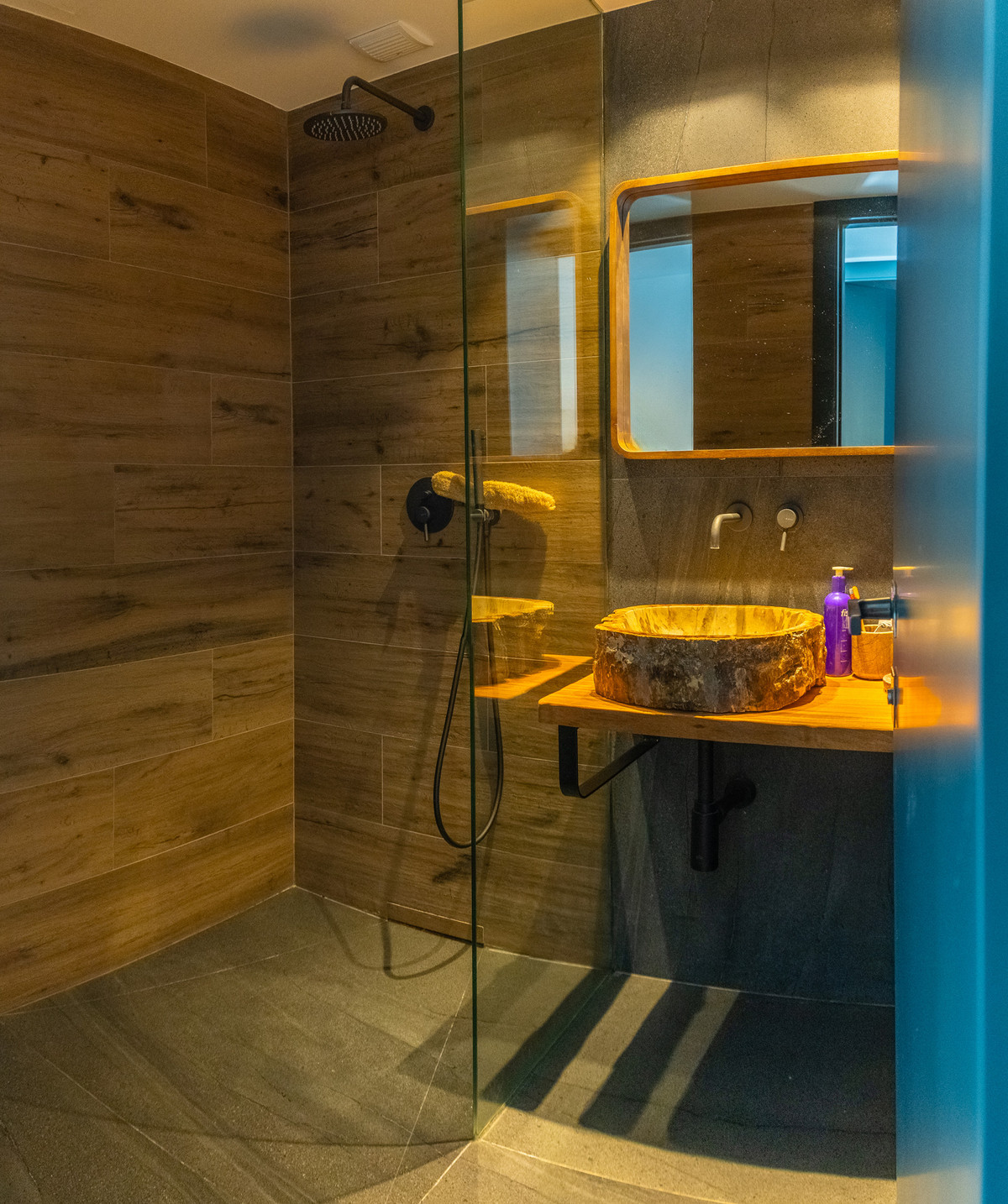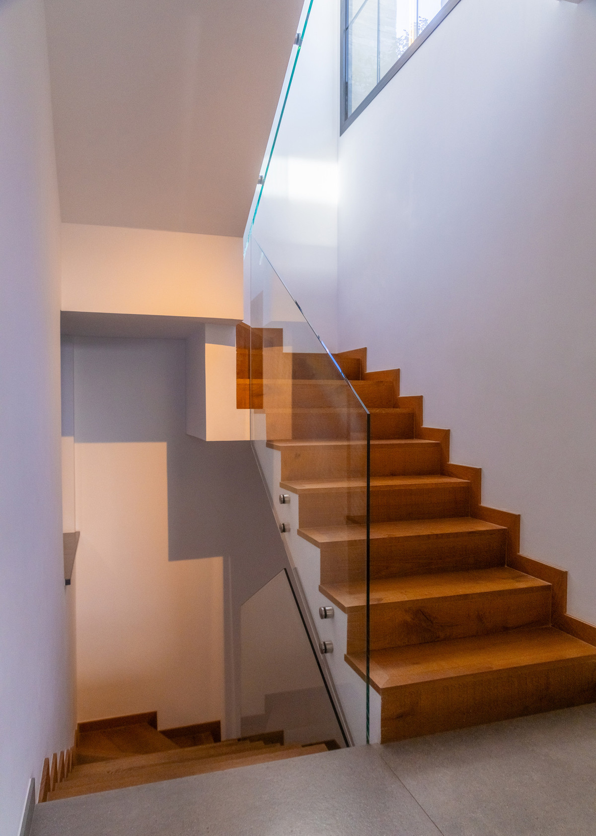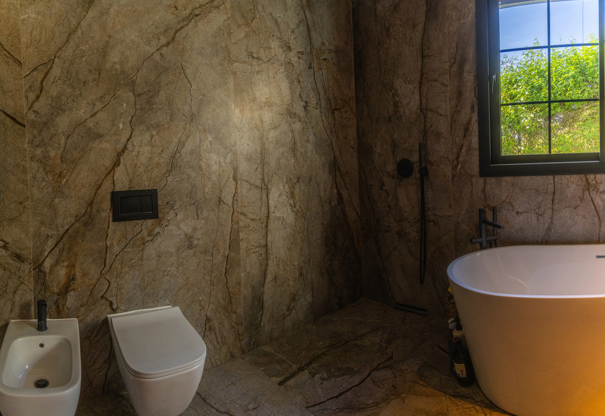 This villa features superior finishes including natural stone accents, a Porcelanosa staircase, and high-grade ceramic flooring. It is equipped with double-glazed windows with an argon chamber and Guardian Sun glass for optimal insulation and energy efficiency.