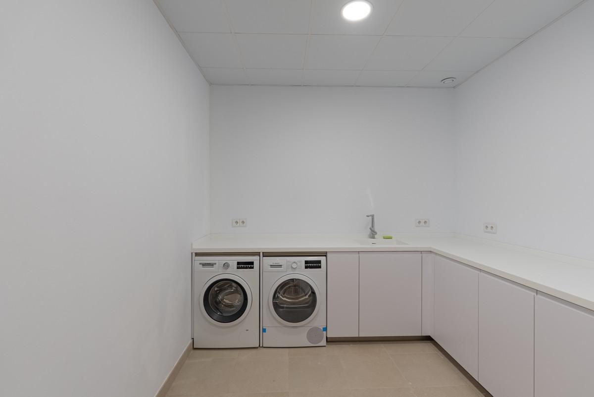 De begane grond heeft een open indeling met een ruime woon- en eetkamer en een ultramoderne designkeuken voorzien van hoogwaardige apparatuur. De kamerhoge ramen verbinden het interieur naadloos met het terras en het zwembad, waardoor een perfecte overgang tussen binnen- en buitenleven ontstaat.